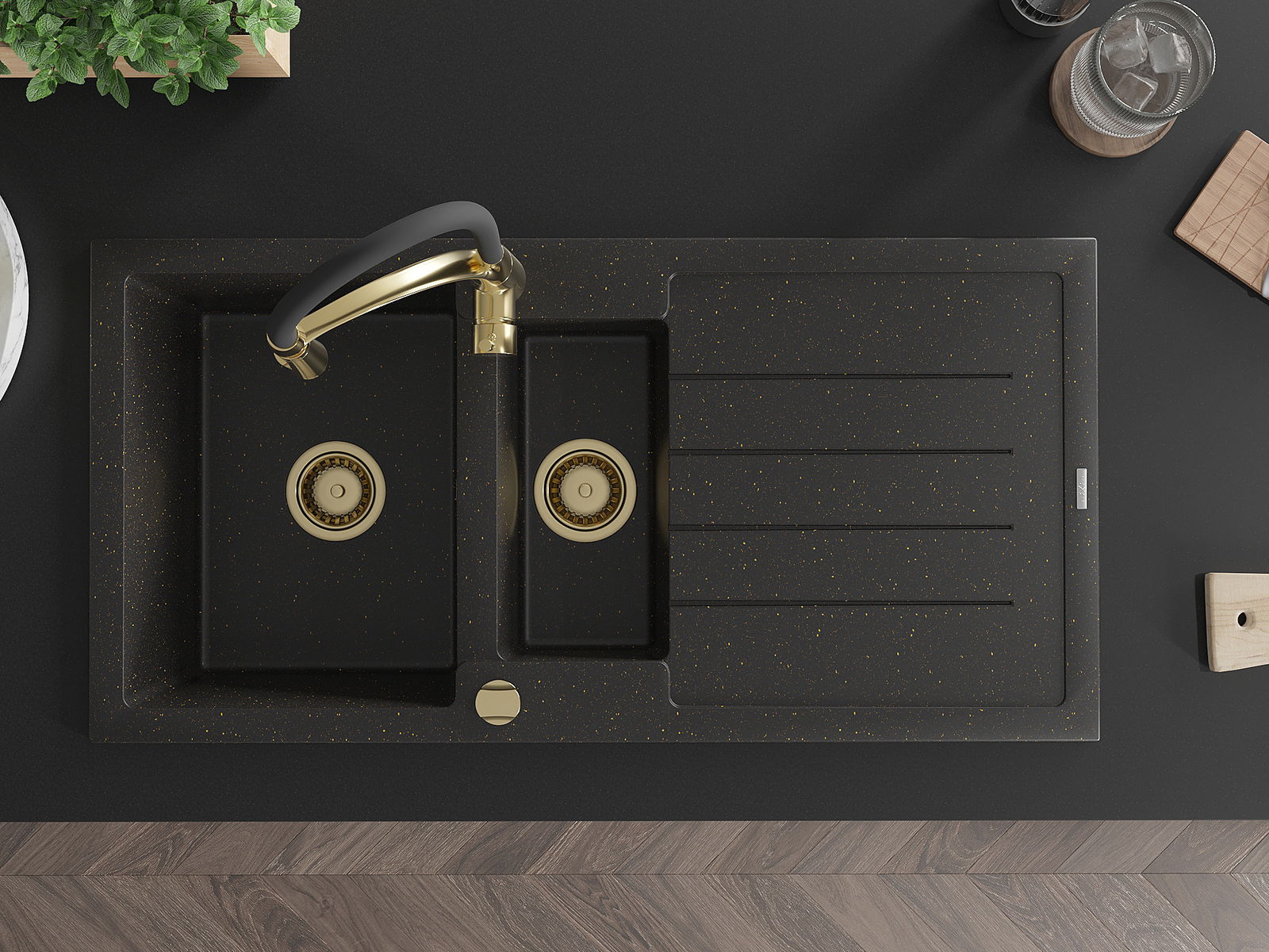 Mexen Andres granitinis 1,5 skylių virtuvės kriauklė su nutekėjimu ir virtuviniu maišytuvu Aster, juoda/auksinis metalikas - 65?