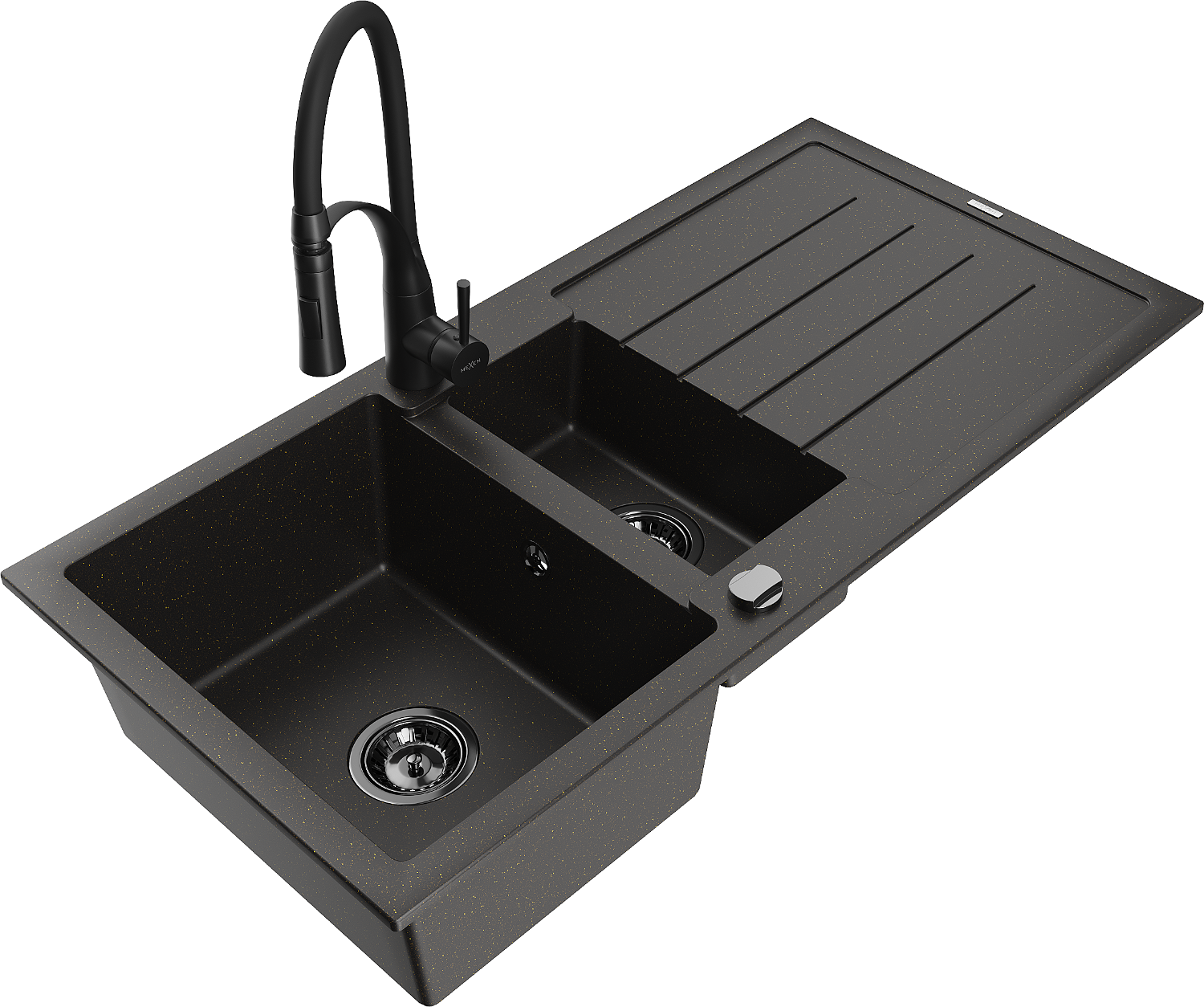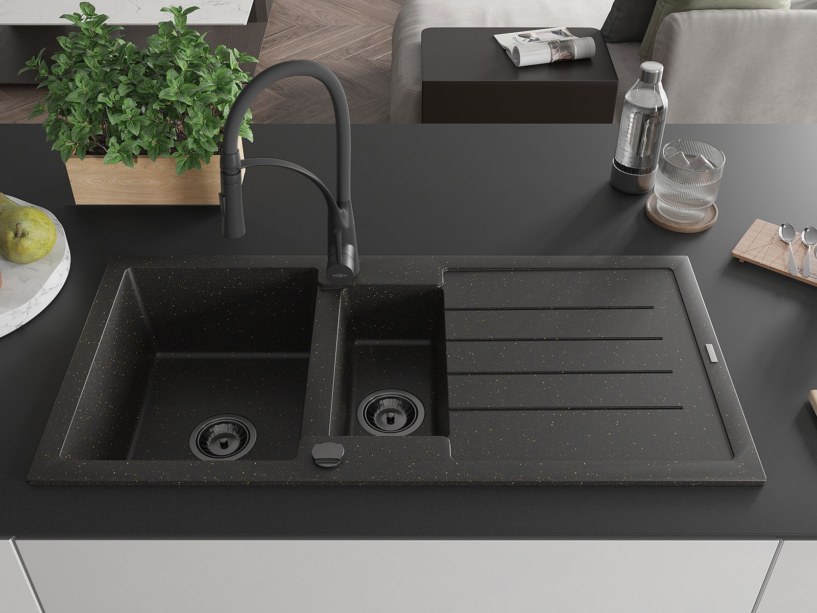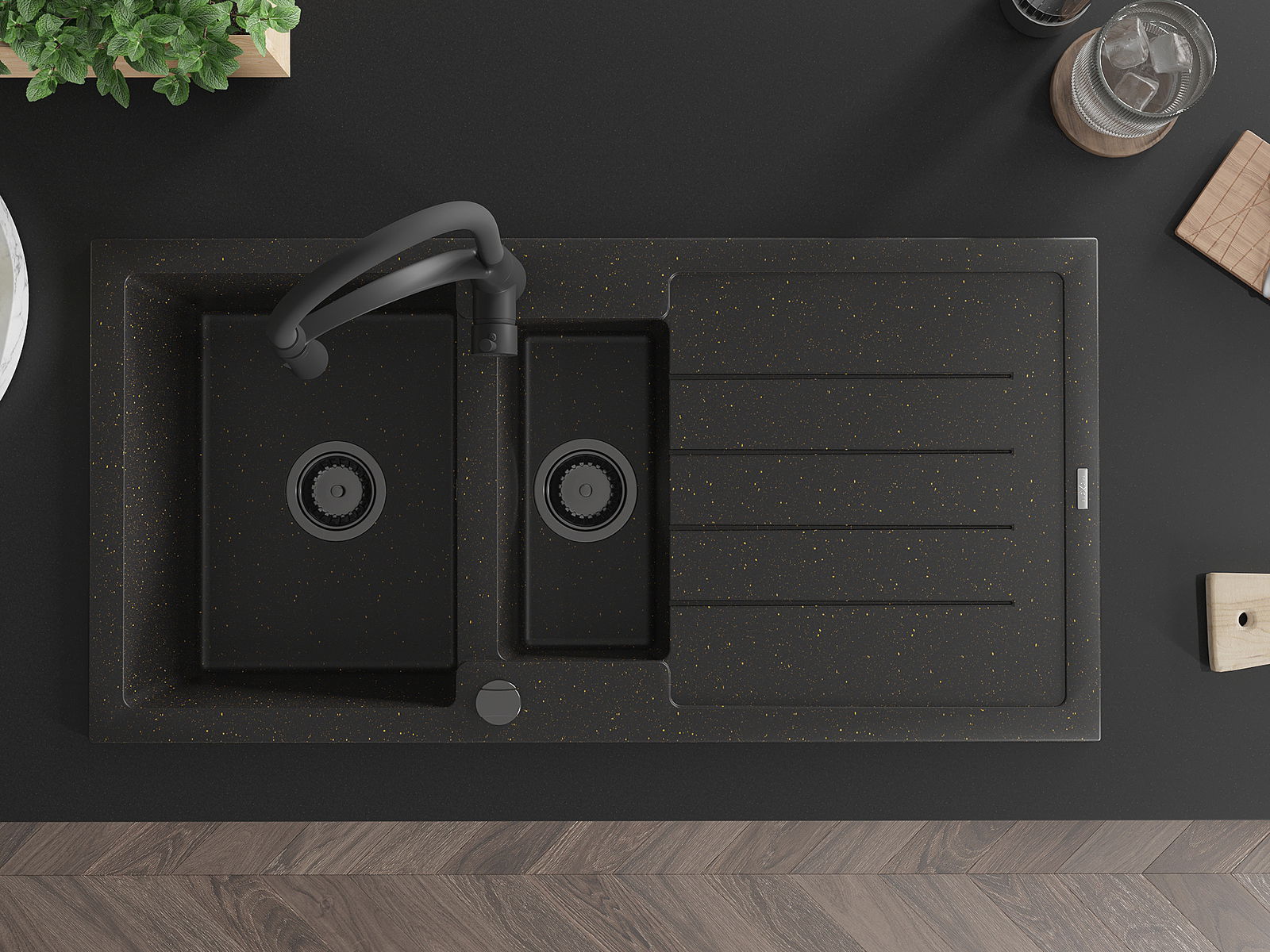 Mexen Andres granitinė 1,5 kamerų kriauklė su nusausintuvu ir virtuvės maišytuvu Aster, juoda/aukso metalikas