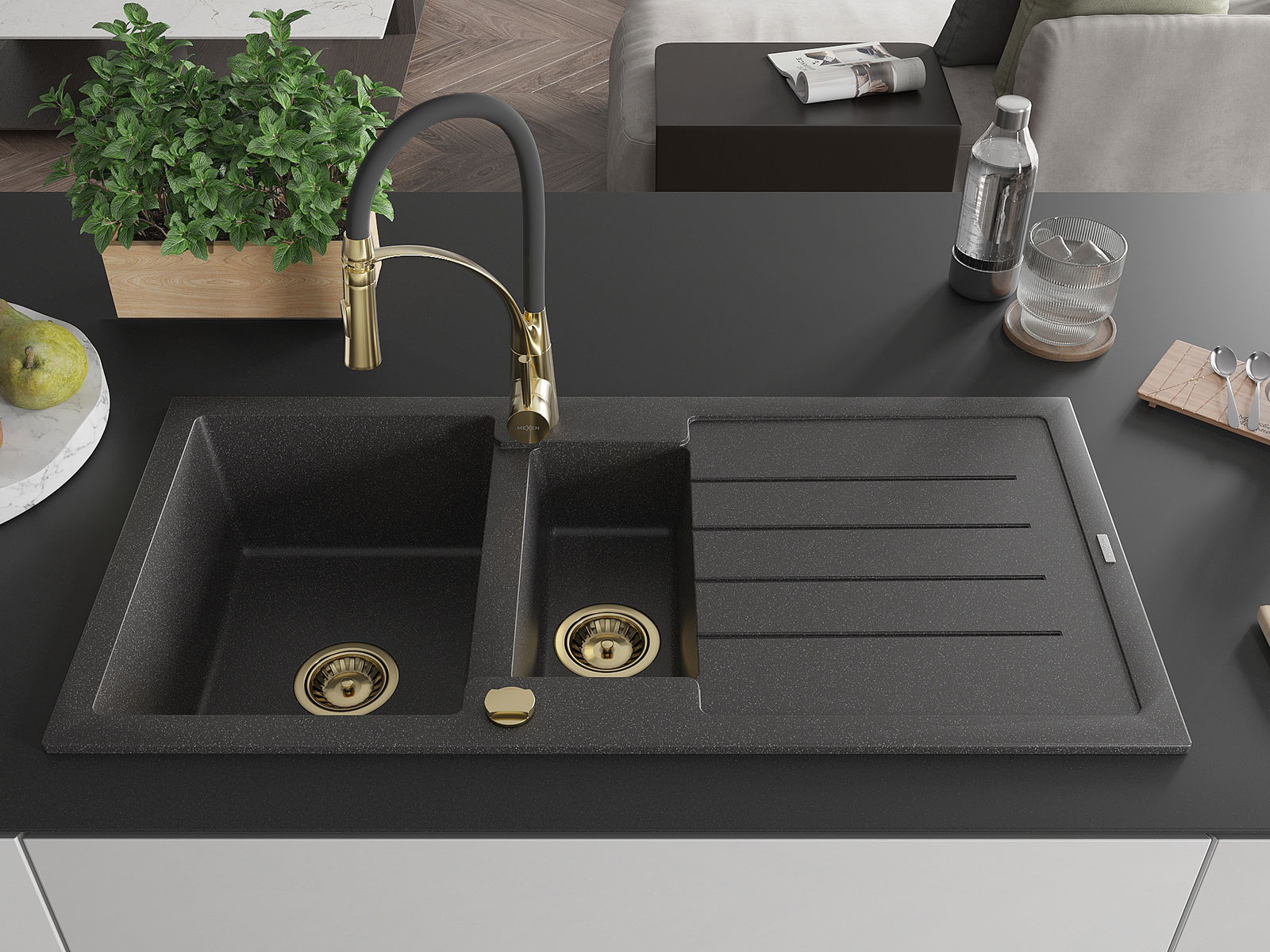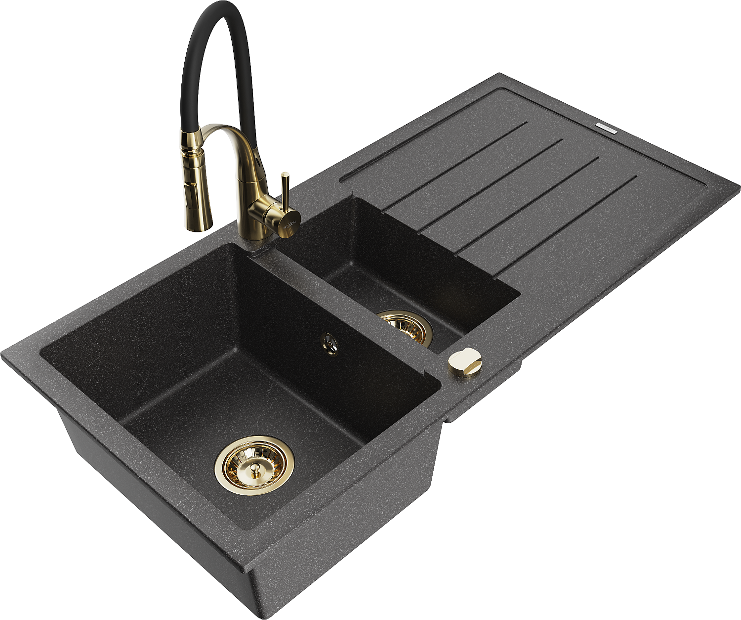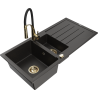 Mexen Andres granitinė 1,5 kamerų plautuvė su nusausintuvu ir virtuviniu maišytuvu Aster, juoda su taškeliais