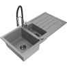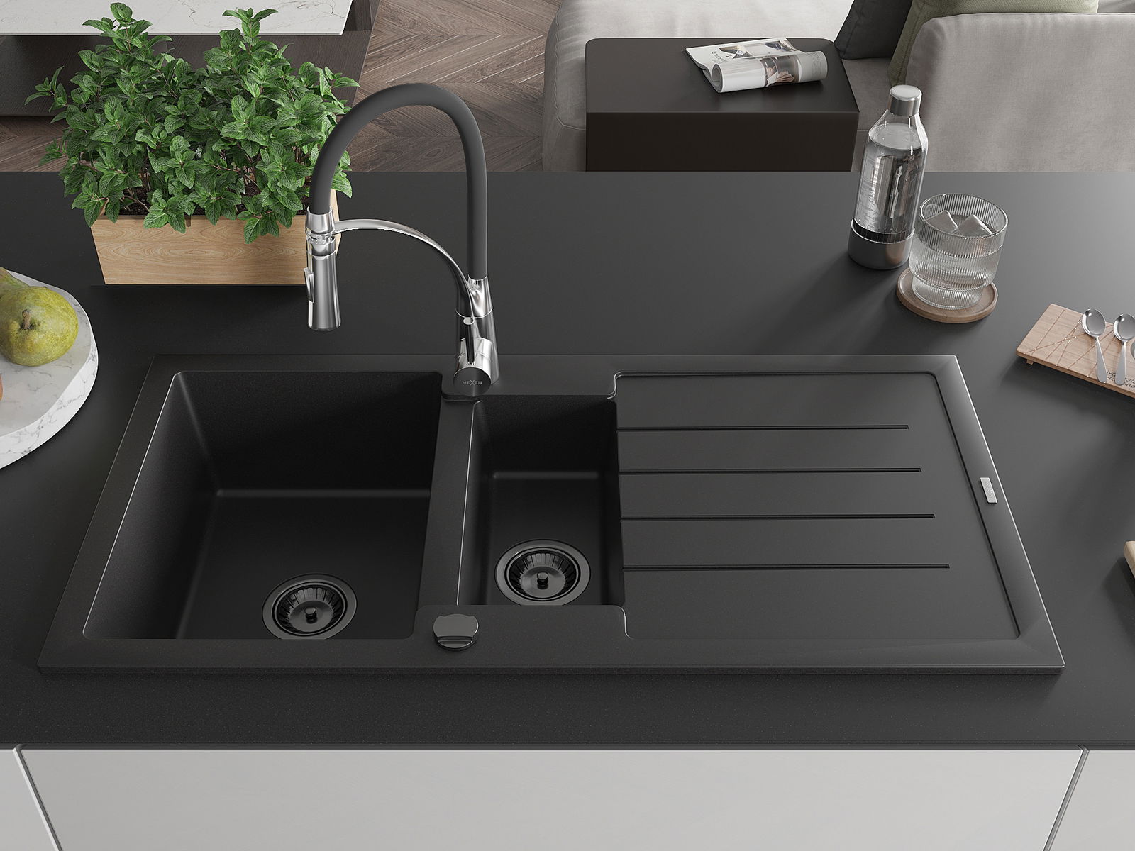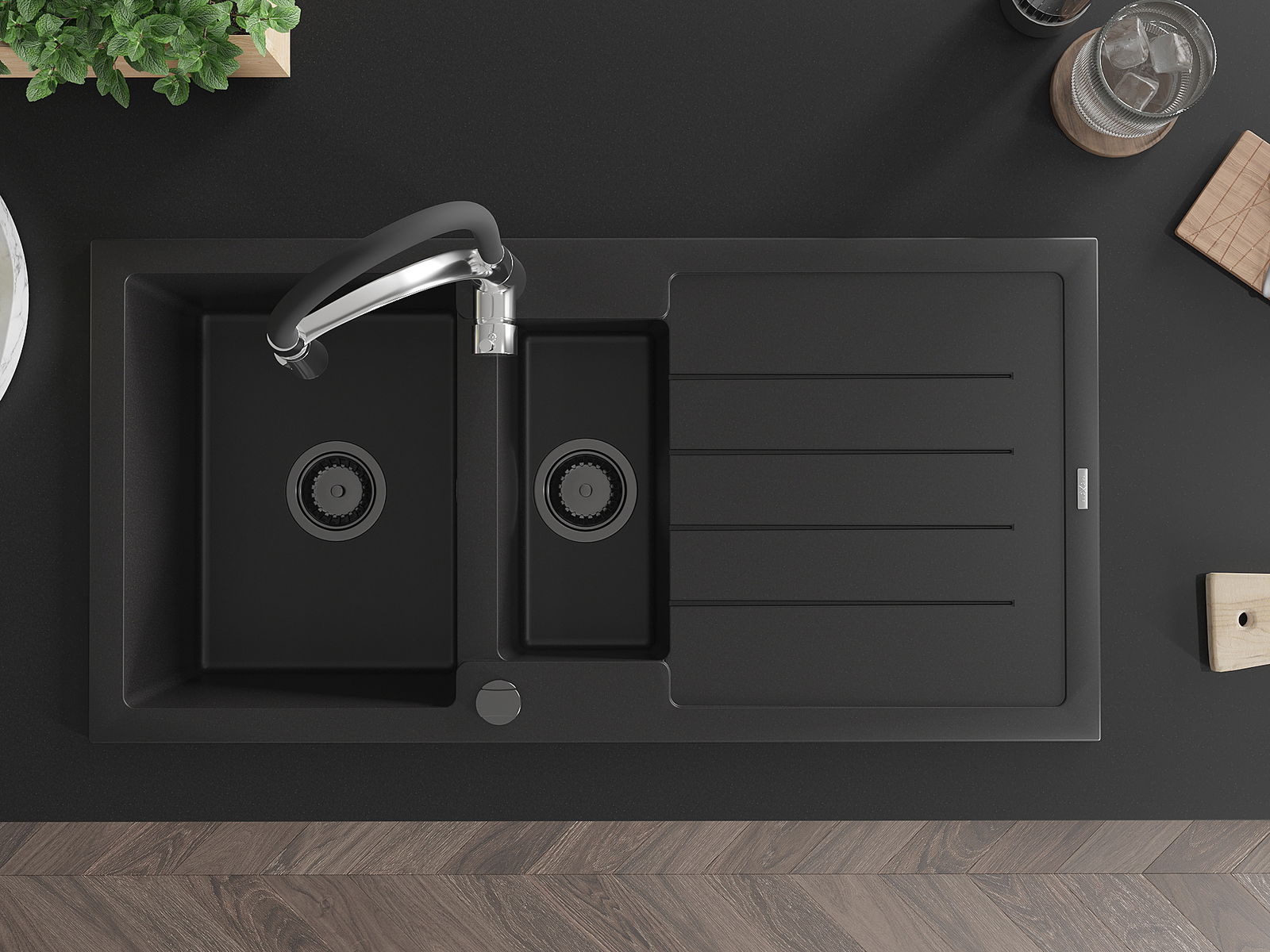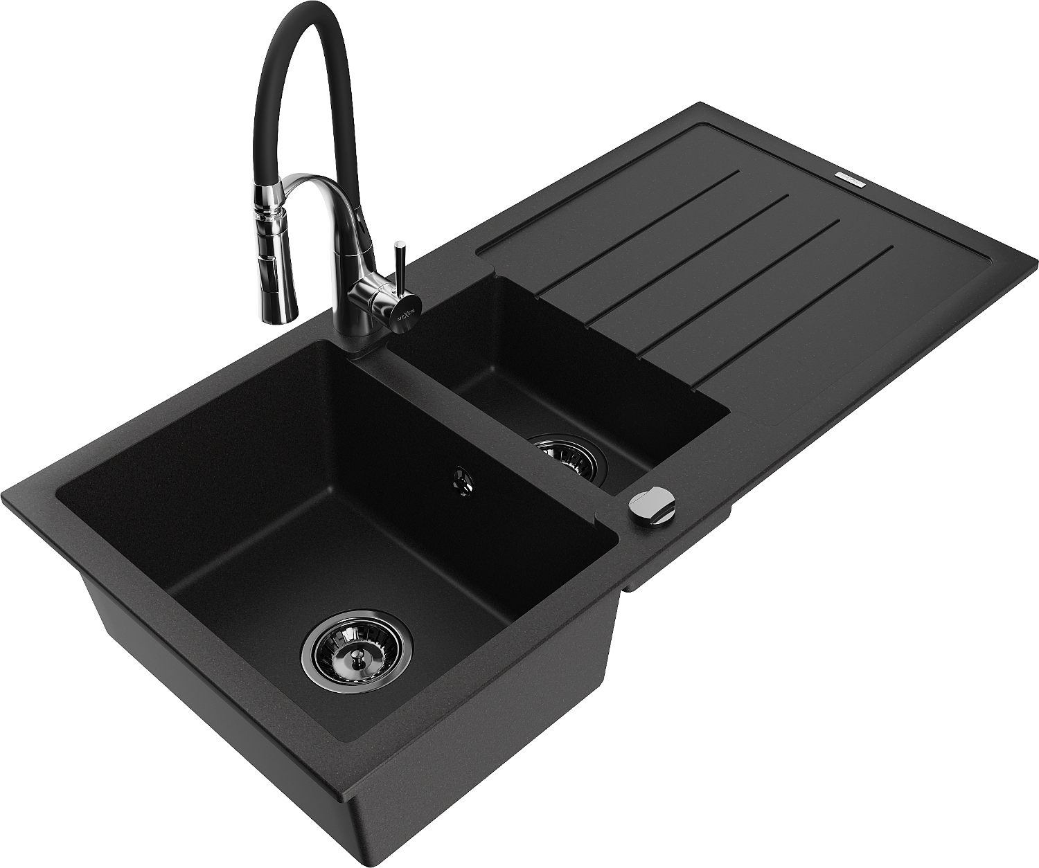 Mexen Andres granitinė kriauklė 1,5 kamerų su nutekėjimu ir virtuviniu maišytuvu Aster, juoda - 6515-77-73450-07-B
