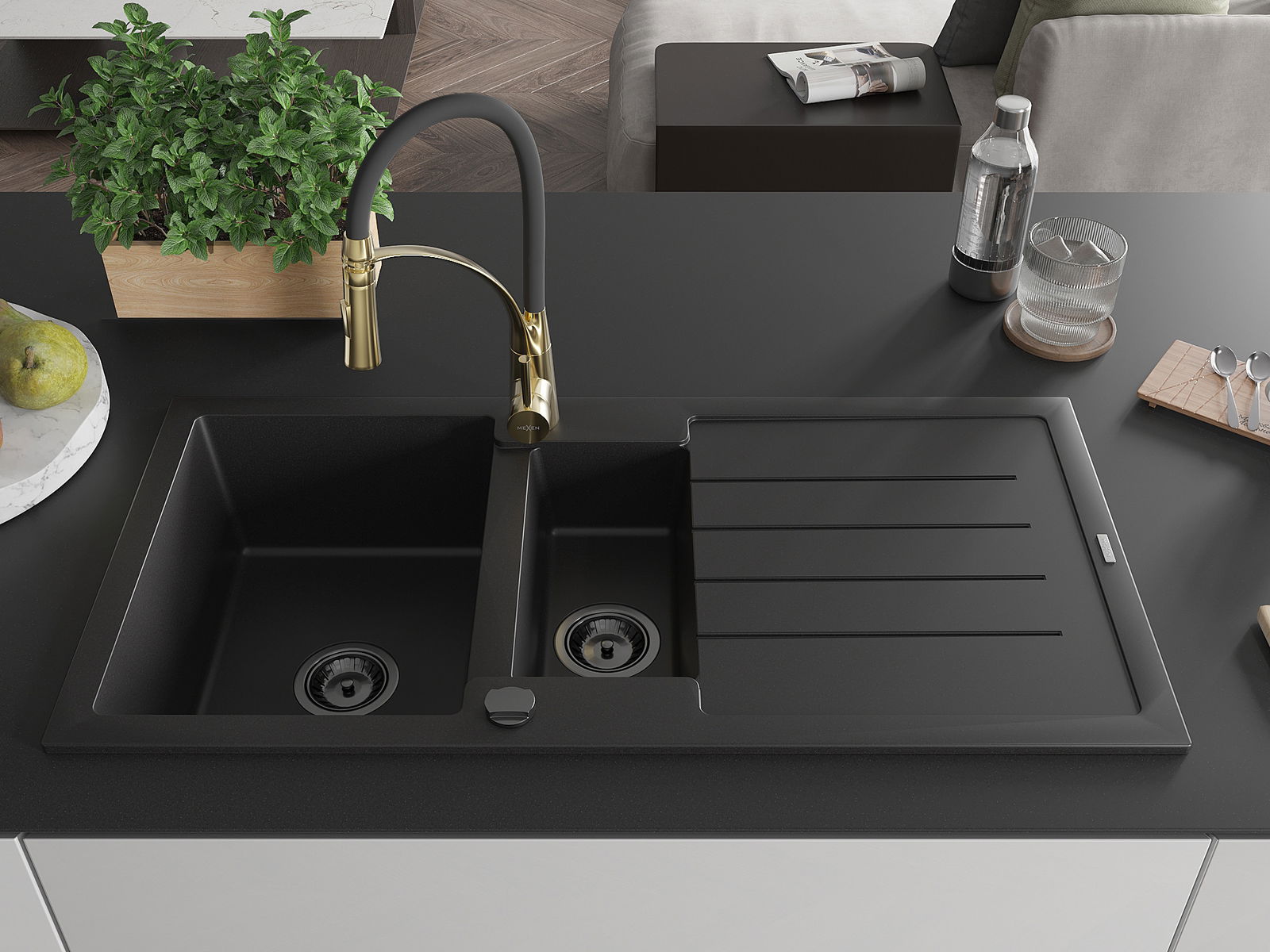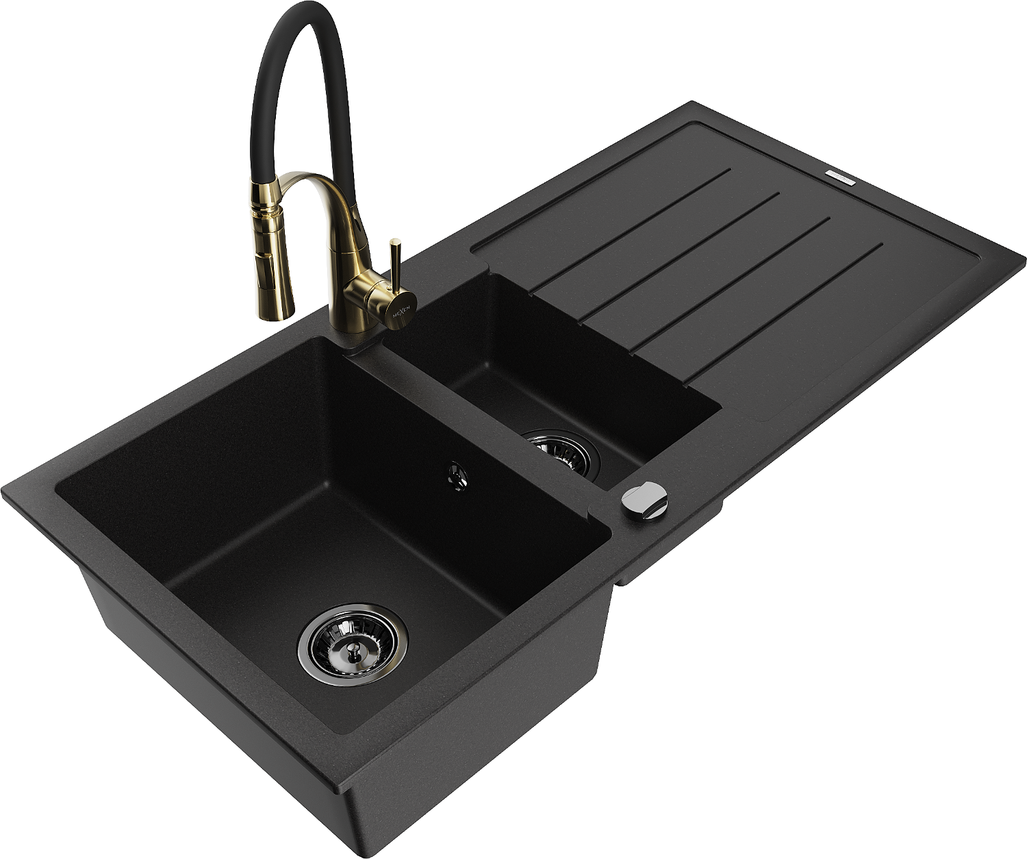Mexen Andres granitinis plautuvė 1,5 kamerų su nuvarvėtoju ir virtuviniu maišytuvu Aster, juodas - 6515-77-73450-57-B