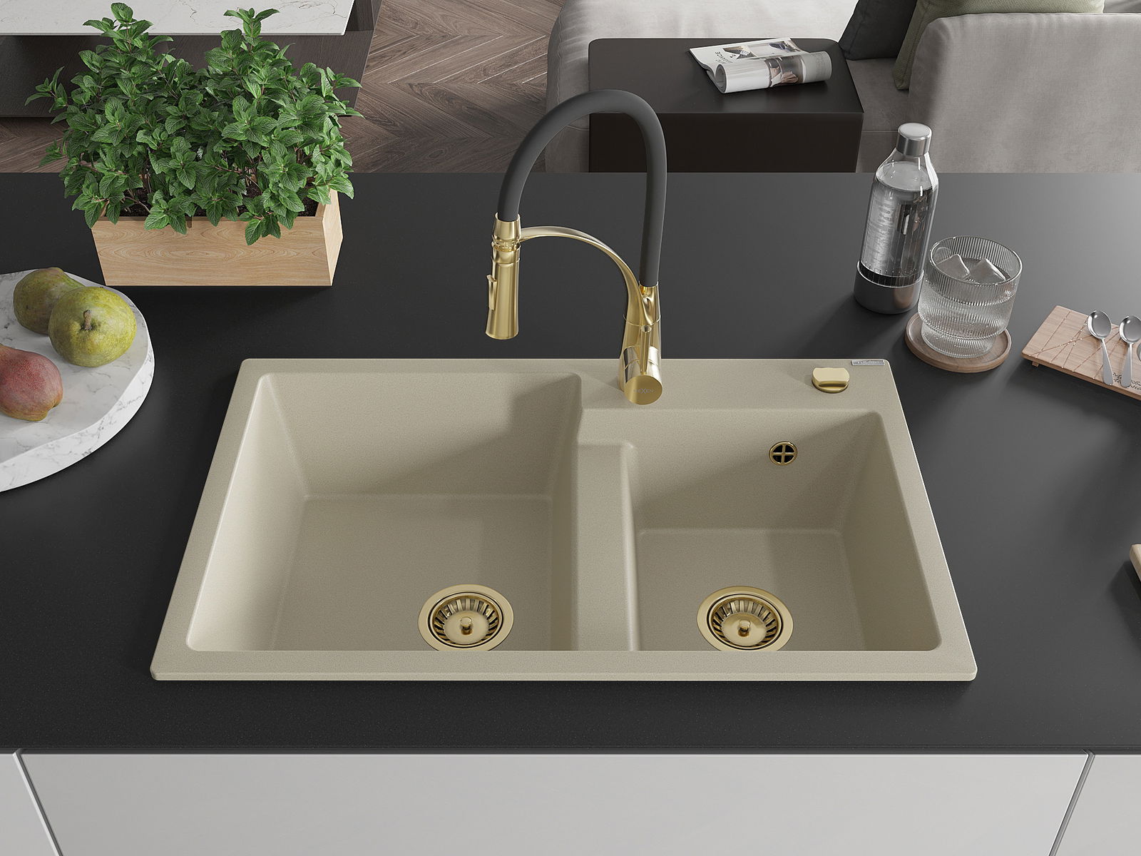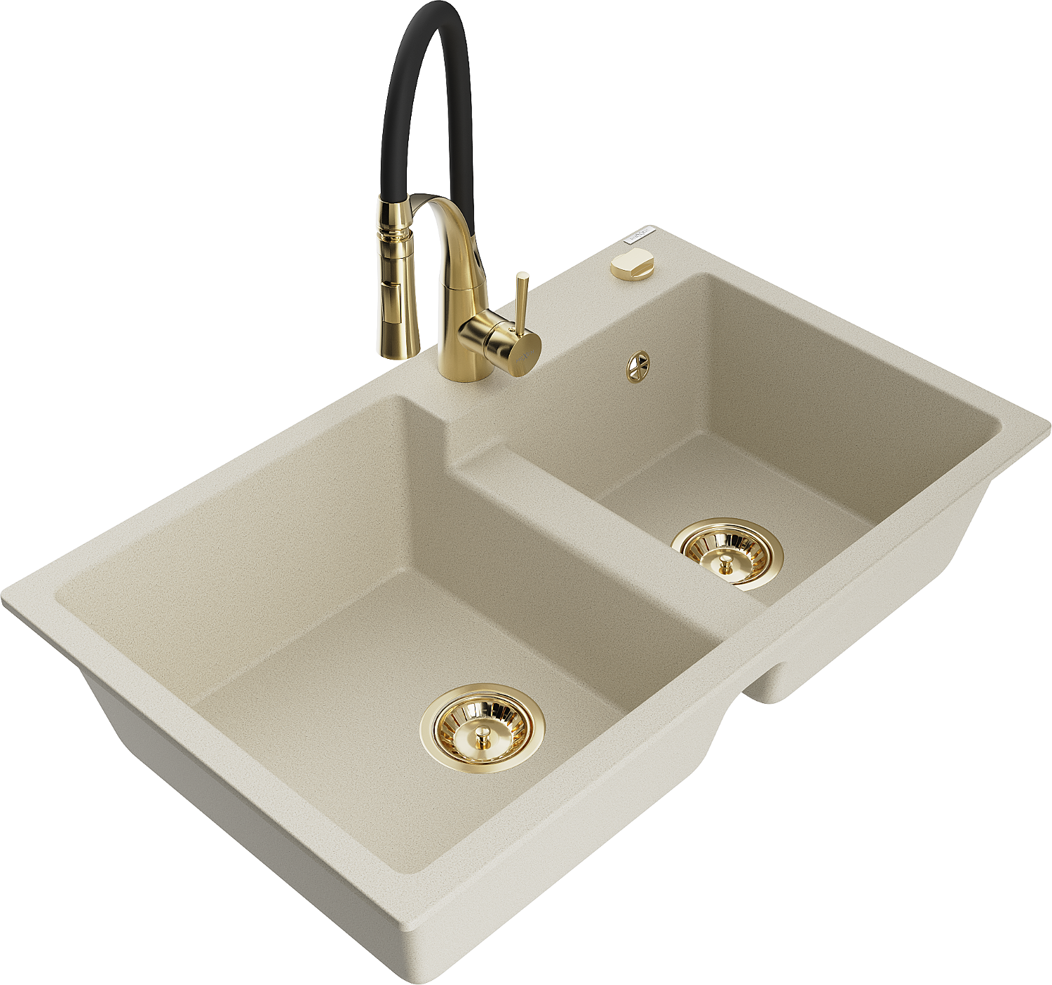 Mexen Tomas granitinė dviejų skyrių kriauklė su virtuviniu maišytuvu Aster, smėlio spalvos - 6516-69-73450-57-G