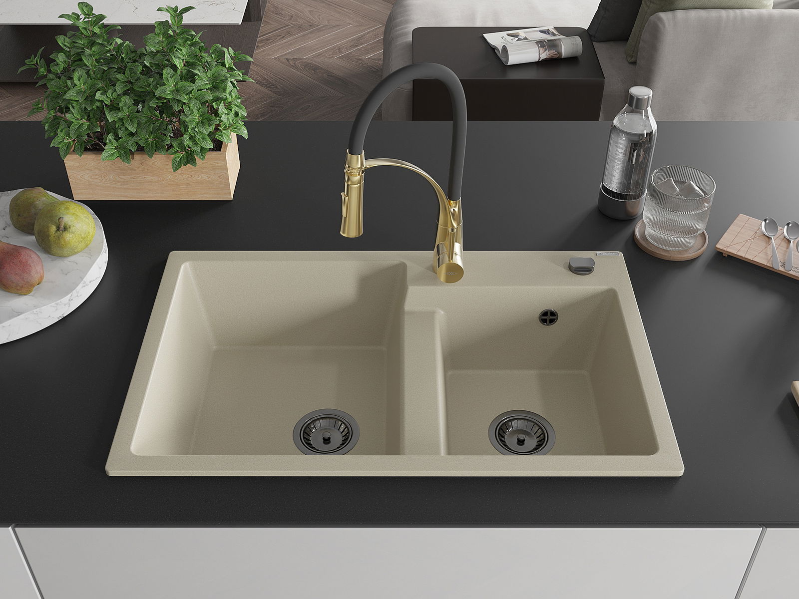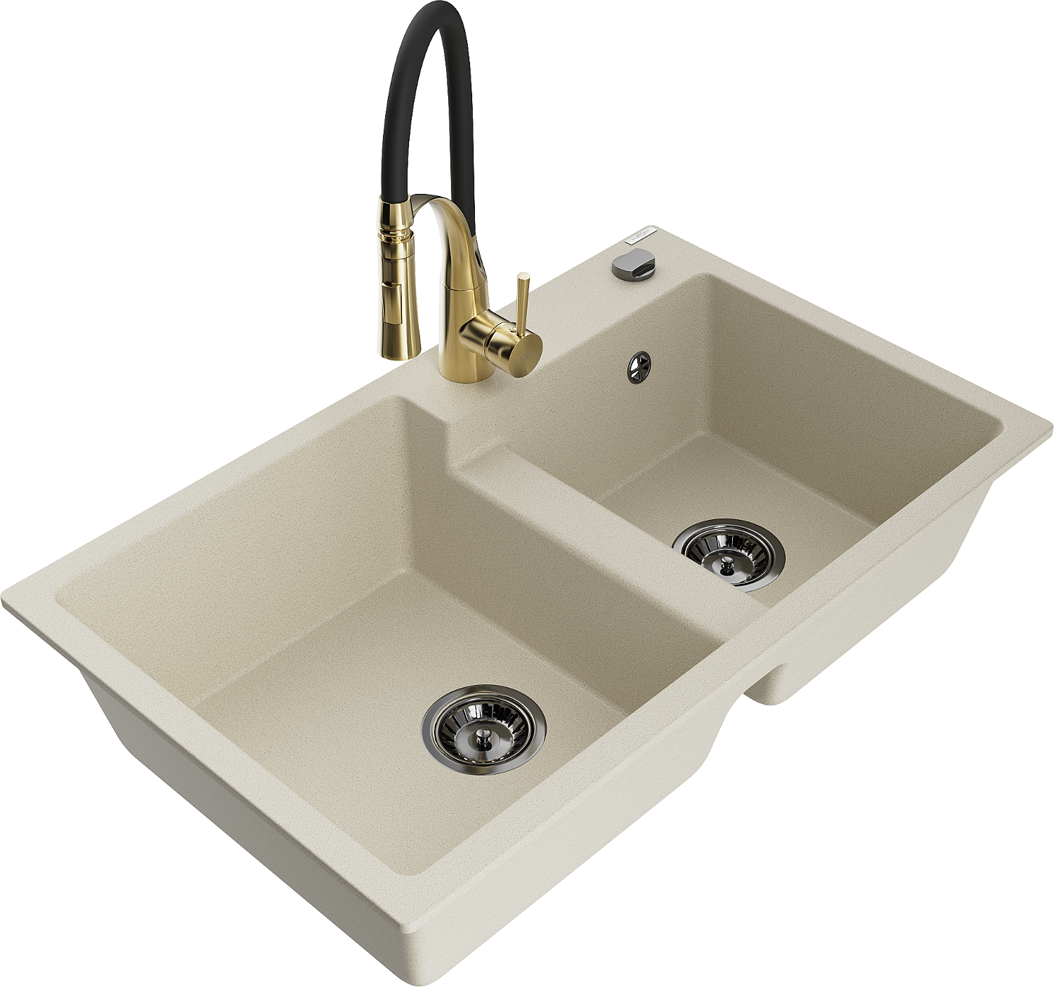 Mexen Tomas granitinė virtuvės kriauklė su 2 dubenimis ir Aster maišytuvu, smėlinė - 6516-69-73450-57-B