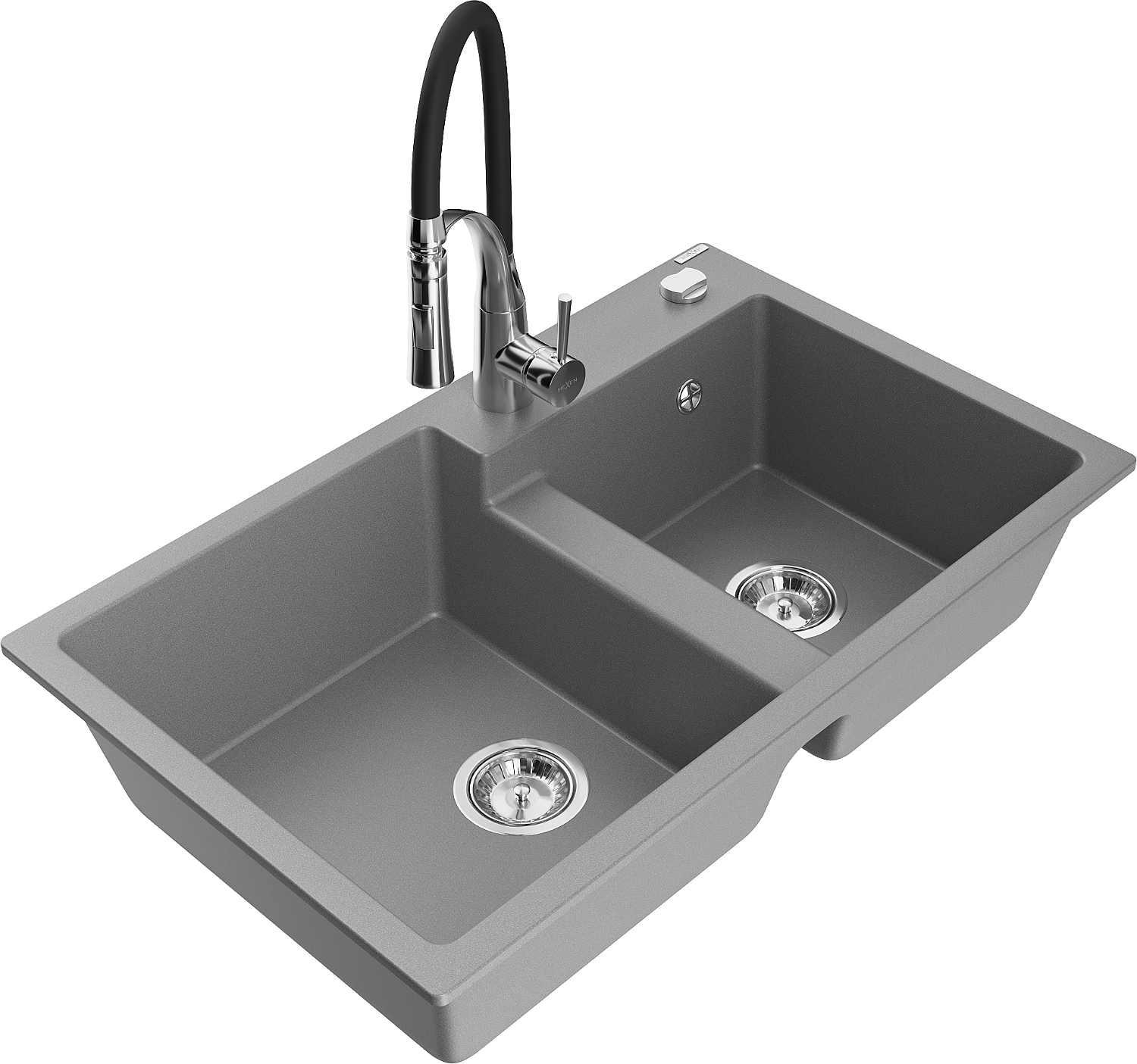 Mexen Tomas granitinis virtuvės kriauklė su 2 skyriais ir virtuviniu maišytuvu Aster, pilka - 6516-71-73450-07