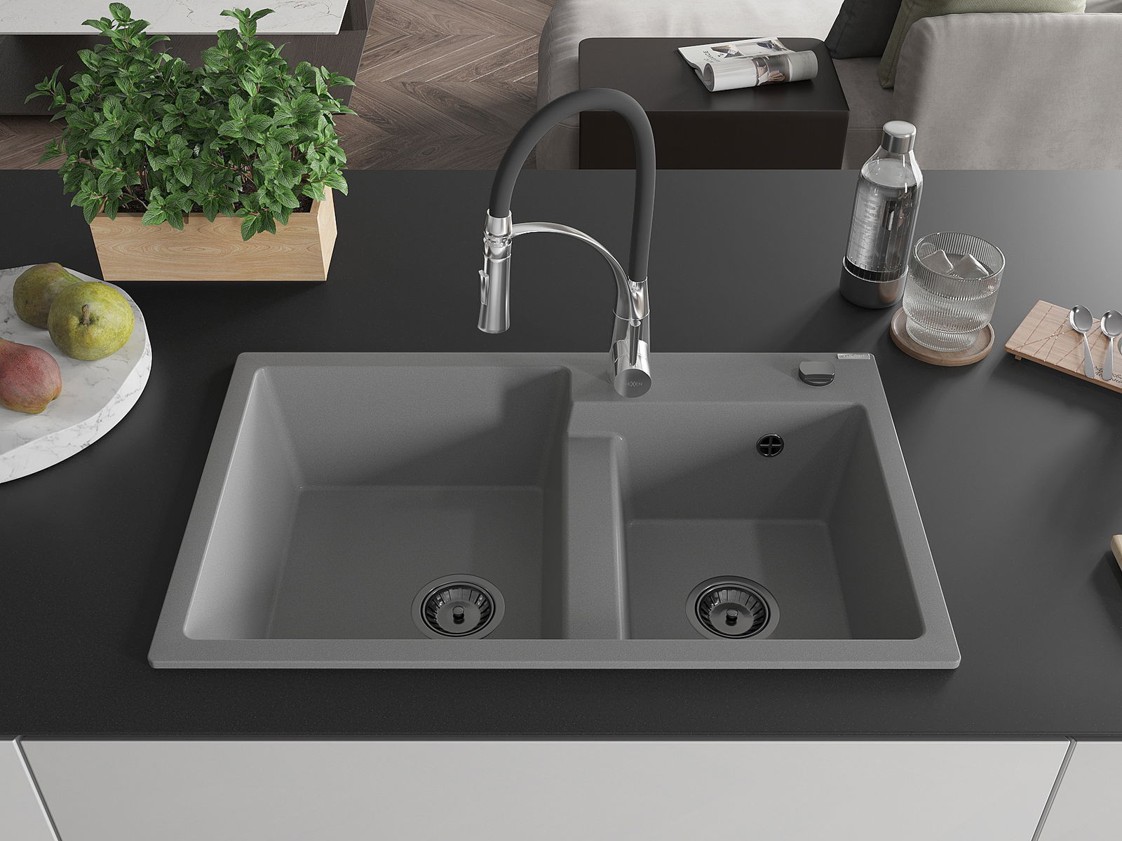 Mexen Tomas granitinė dviejų skylių kriauklė su virtuviniu maišytuvu Aster, pilka - 6516-71-73450-07-B
