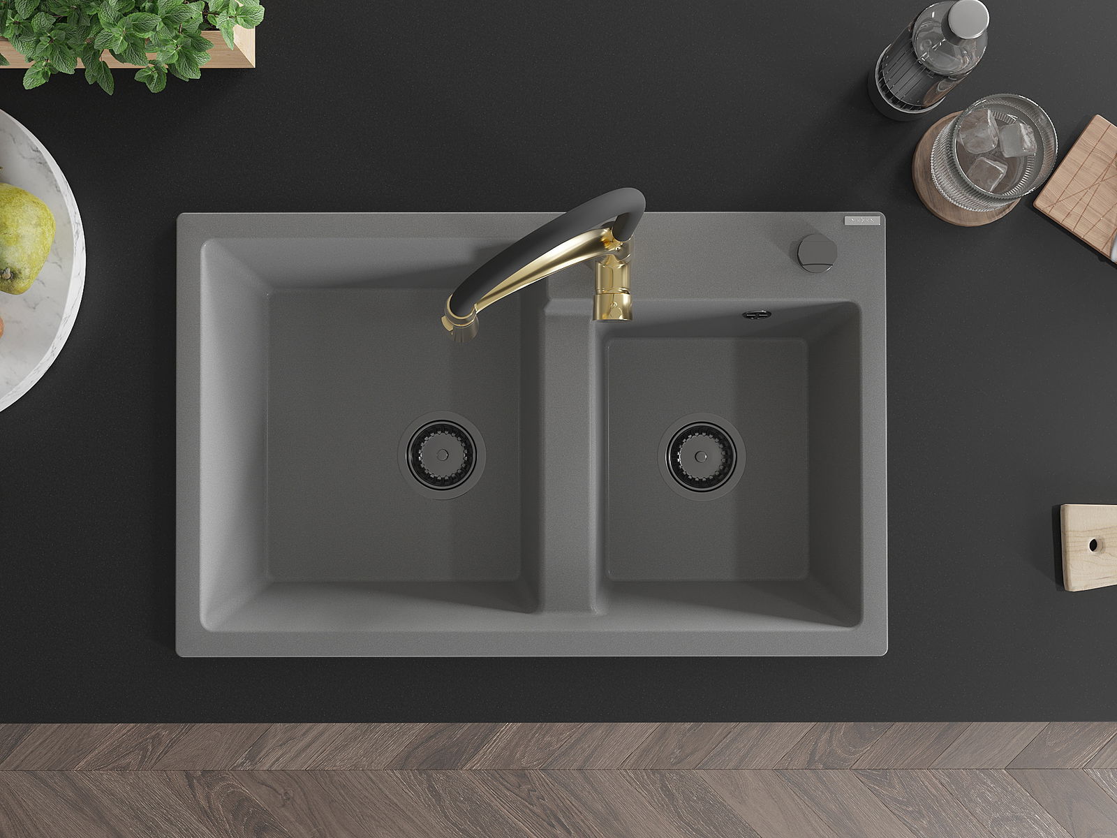 Mexen Tomas granito virtuvės plautuvė 2 skylių su virtuvės maišytuvu Aster, pilka - 6516-71-73450-57-B