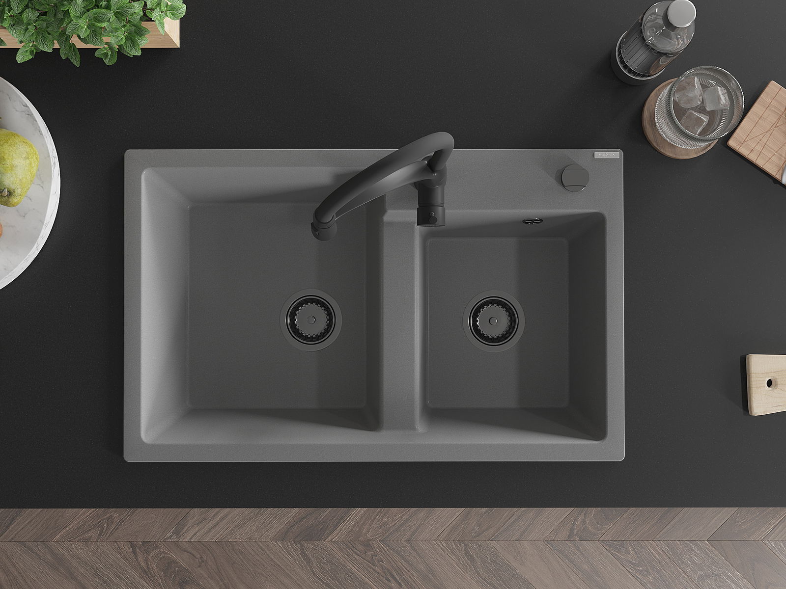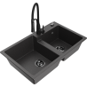 Mexen Tomas granitinė 2-jų kamerų kriauklė su virtuviniu maišytuvu Aster, pilka - 6516-71-73450-70-B