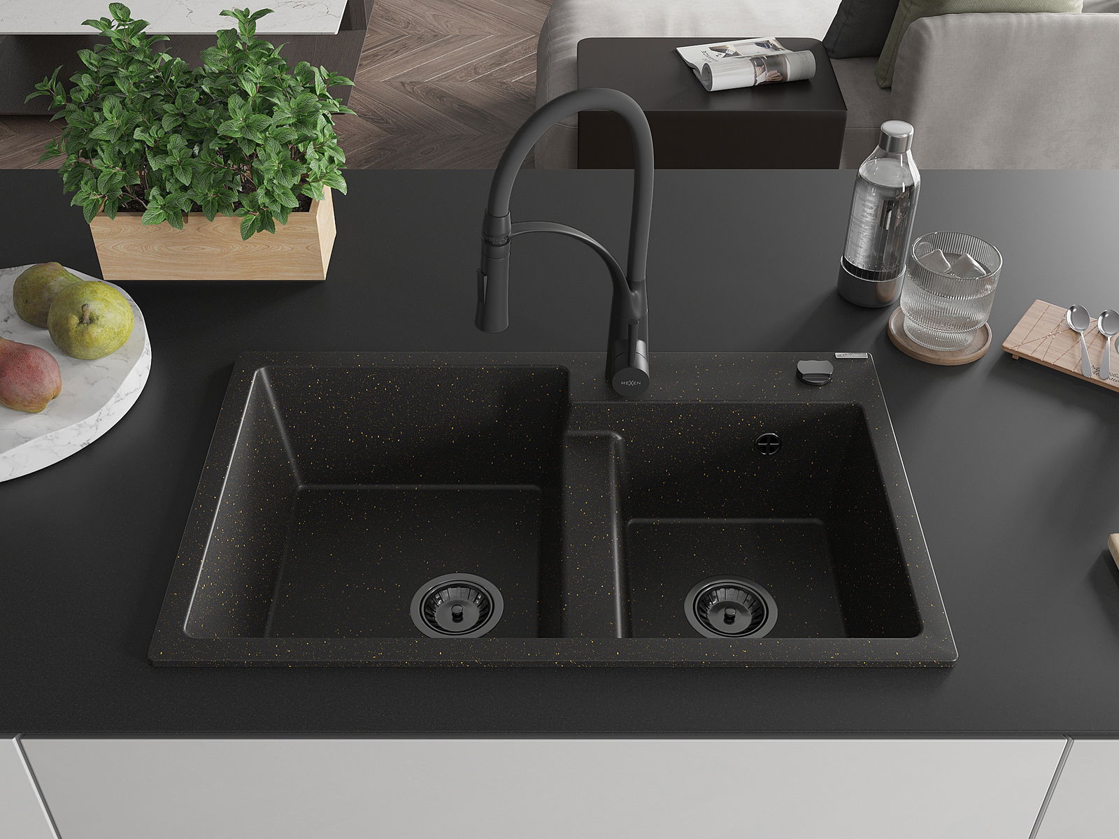 Mexen Tomas granitinė virtuvės kriauklė 2-jų skyrių su virtuvės maišytuvu Aster, juodas/auksinis metalikas - 6516-75-73450-70-B