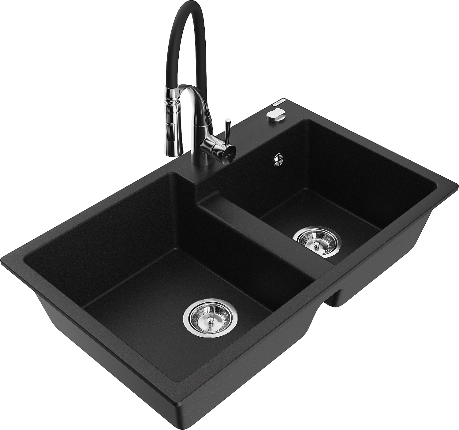 Mexen Tomas granitinė dviejų skylių plautuvė su virtuviniu maišytuvu Aster, juoda - 6516-77-73450-07