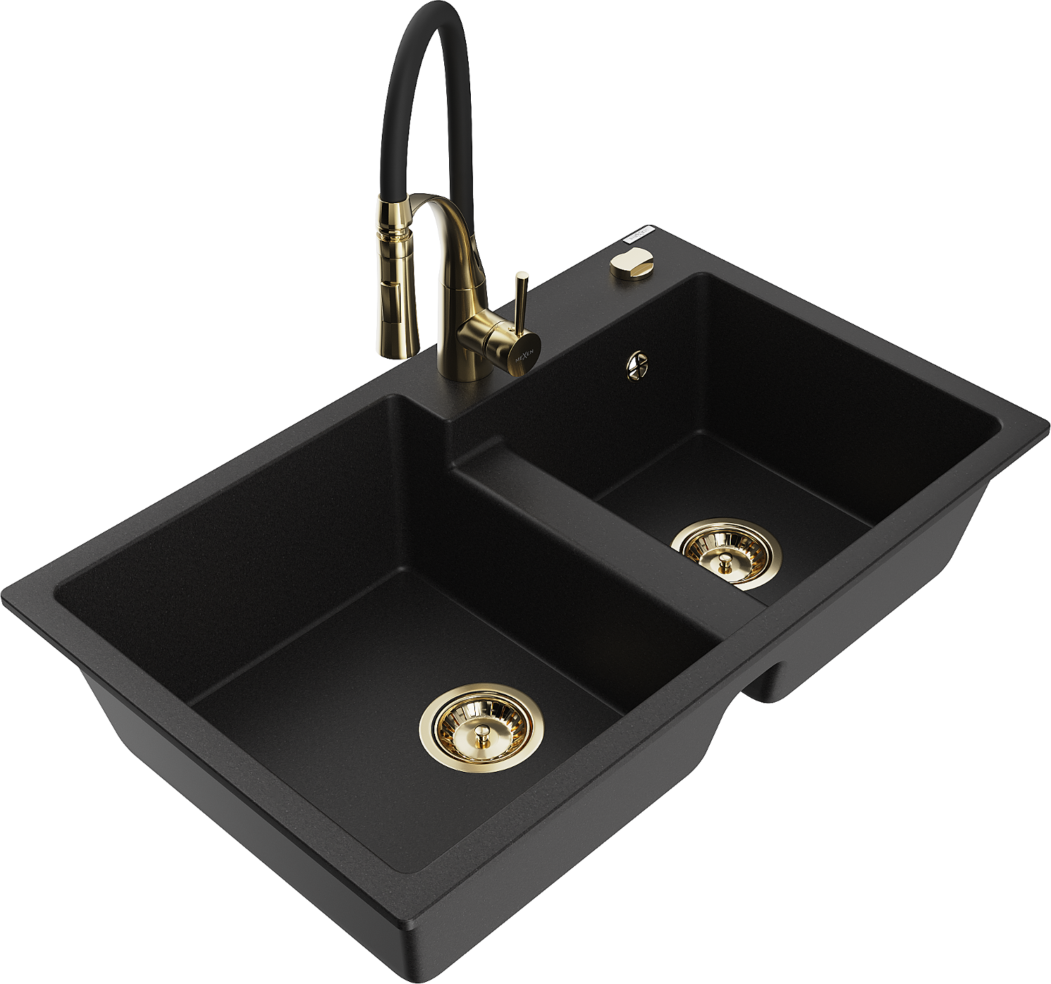 Mexen Tomas granito plautuvė su 2 kameromis ir virtuvininiu maišytuvu Aster, juoda - 6516-77-73450-57-G