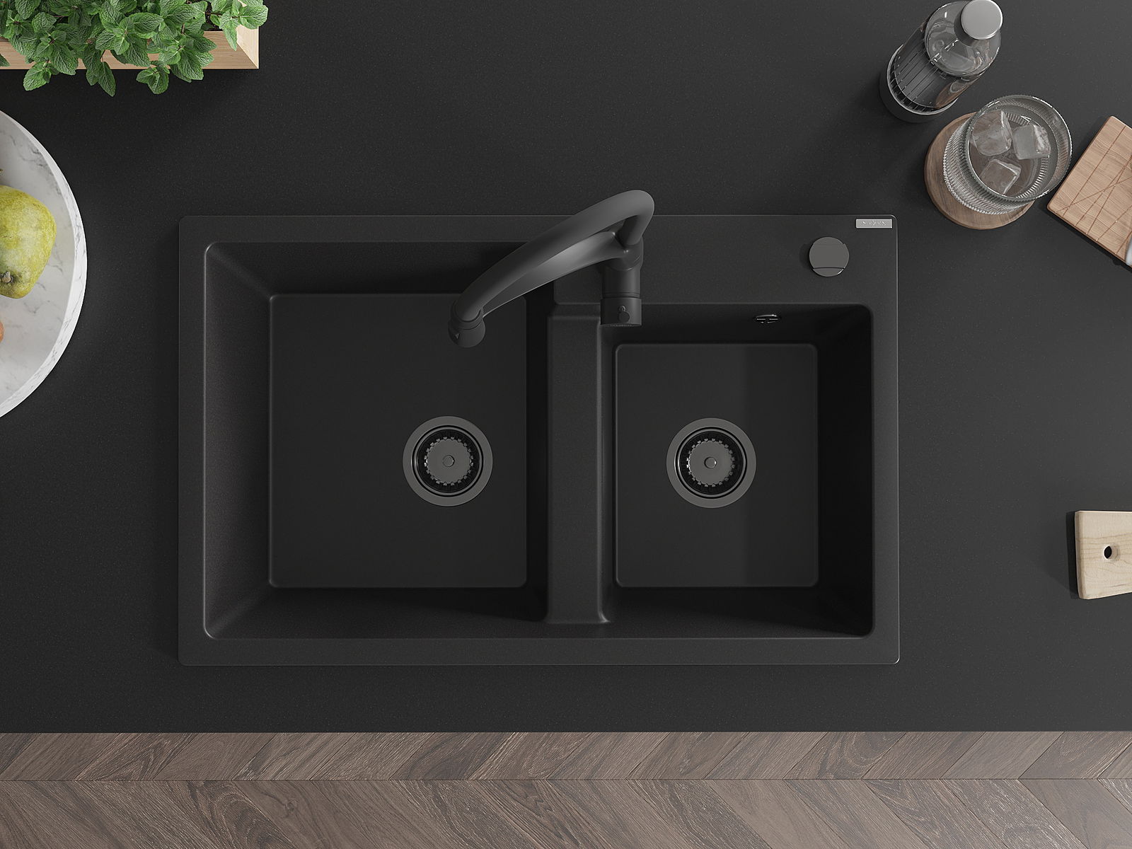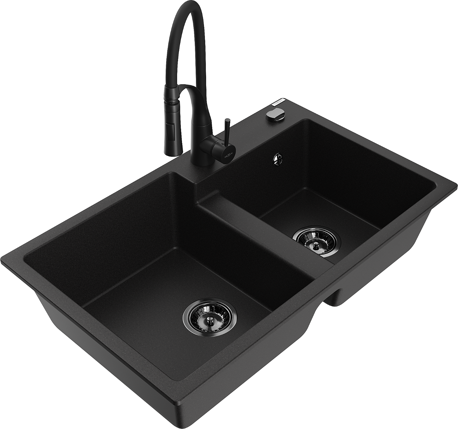 Mexen Tomas dviejų kamerų granitinis plautuvas su virtuviniu maišytuvu Aster, juodas - 6516-77-73450-70-B