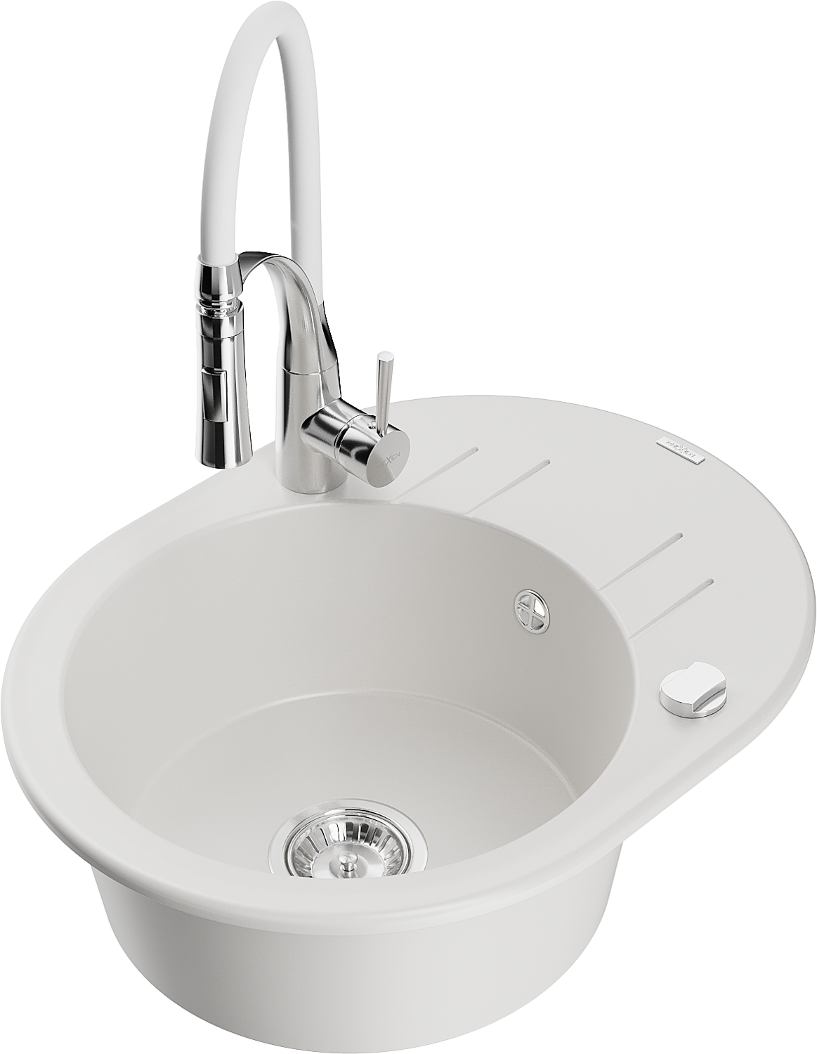 Mexen Kevin granito plautuvė su vienu dubeniu, nuvarvėjimo zonu ir virtuviniu maišytuvu Aster, balta - 6517-20-73450-02