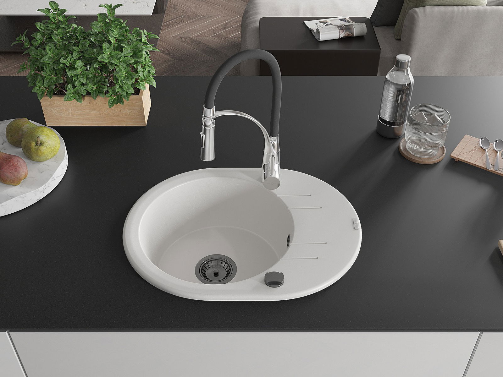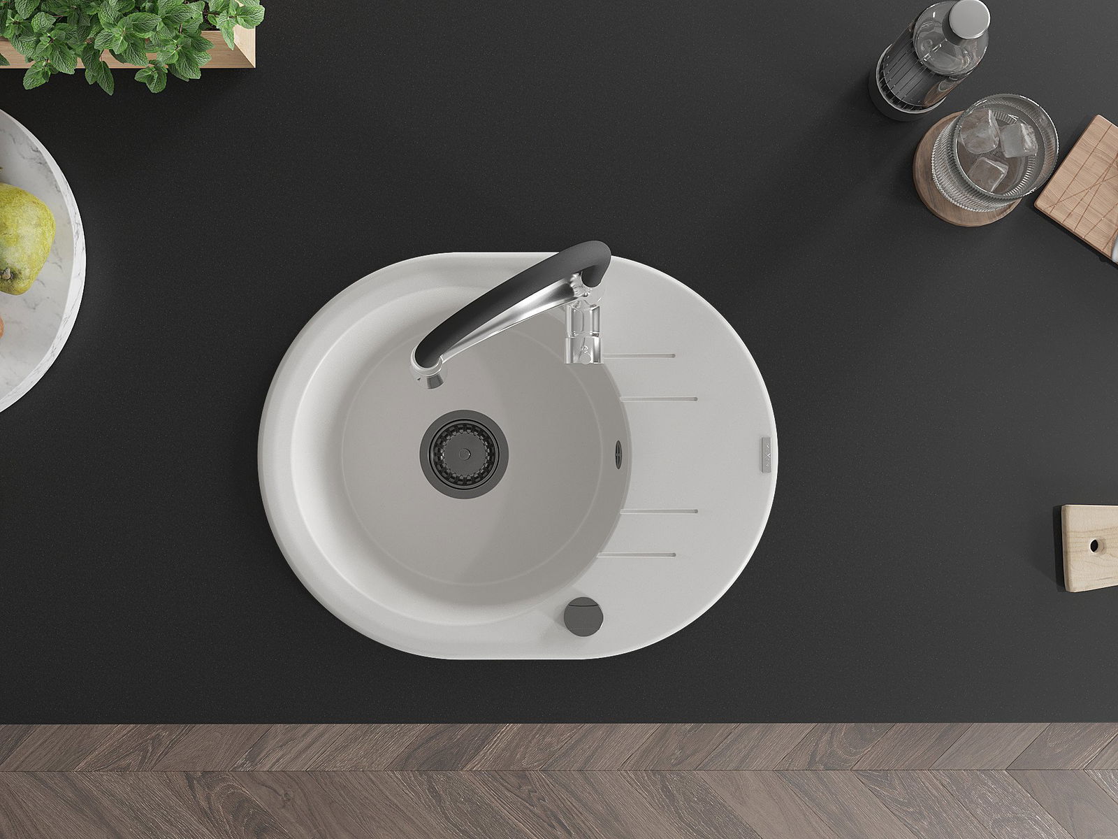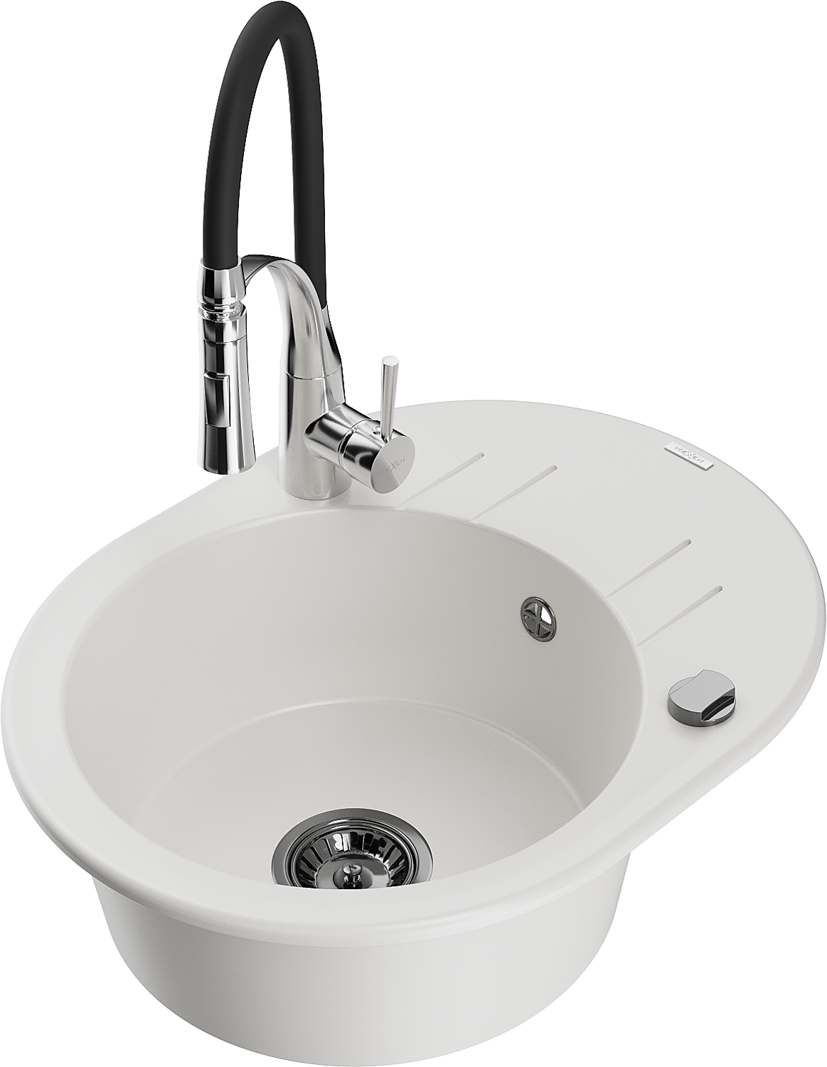 Mexen Kevin granitinė vienos kriauklės plautuvė su nusausintuvu ir virtuviniu maišytuvu Aster, balta - 6517-20-73450-07-B