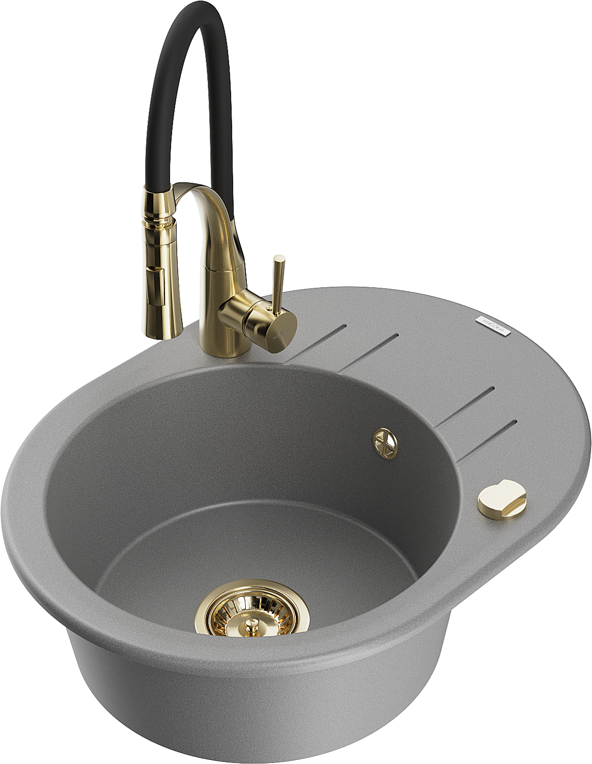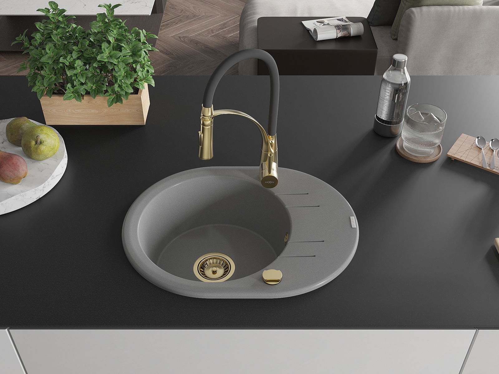 Mexen Kevin granitinis virtuvės kriauklė 1-sekcijinė su drenažo zona ir virtuviniu maišytuvu Aster, pilka - 6517-71-73450-57-G