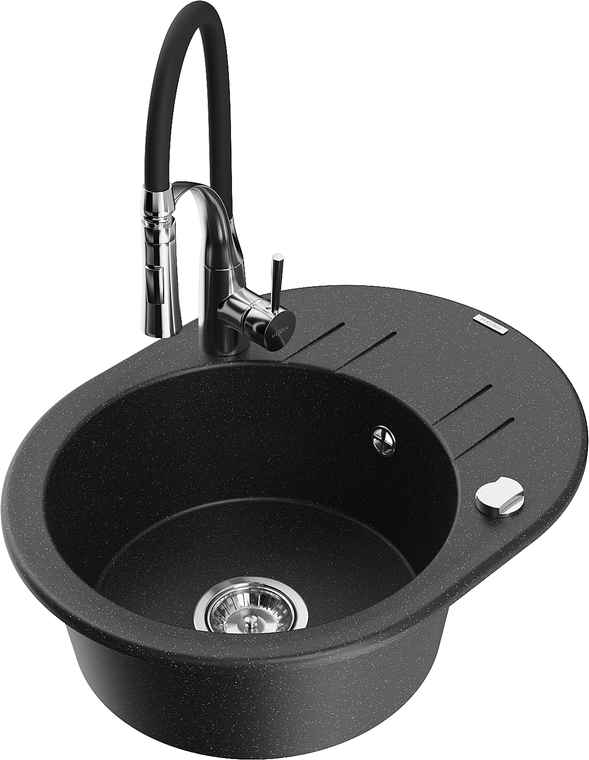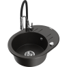 Mexen Kevin granitinė vienos komeros kriauklė su nutekamąja zona ir virtuviniu maišytuvu Aster, juoda/sidabro metaliko
