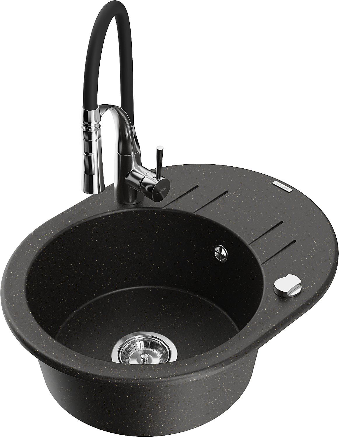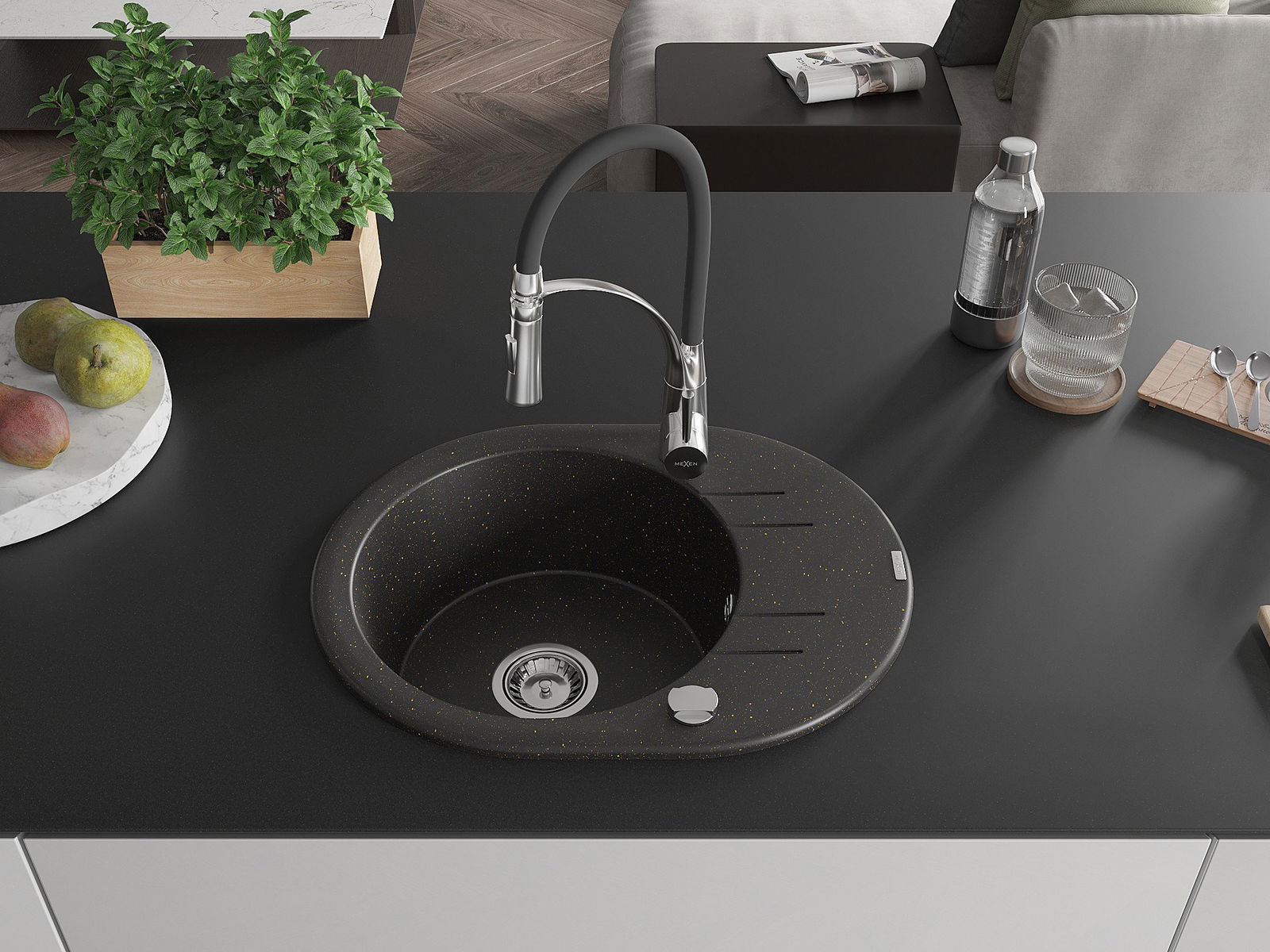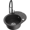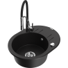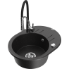 Mexen Kevin vienos komoros granitinė kriauklė su nusausintuvu ir Aster virtuvės maišytuvu, juoda/auksinė metalika