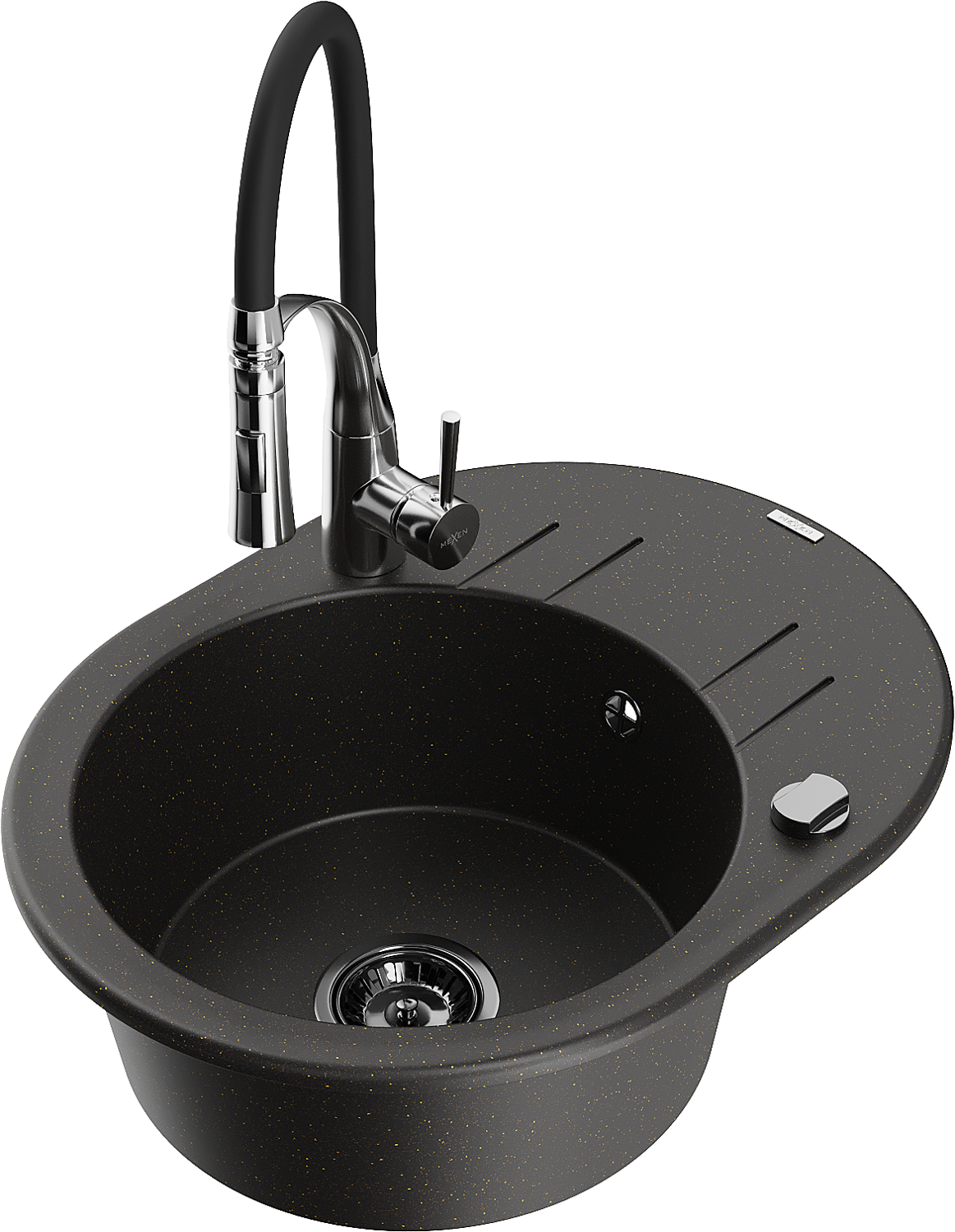 Mexen Kevin vienos kameros granitinis virtuvės kriauklė su lentyna ir maišytuvu Aster, juoda/auksinis metalikas - 6517-75-73450?