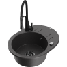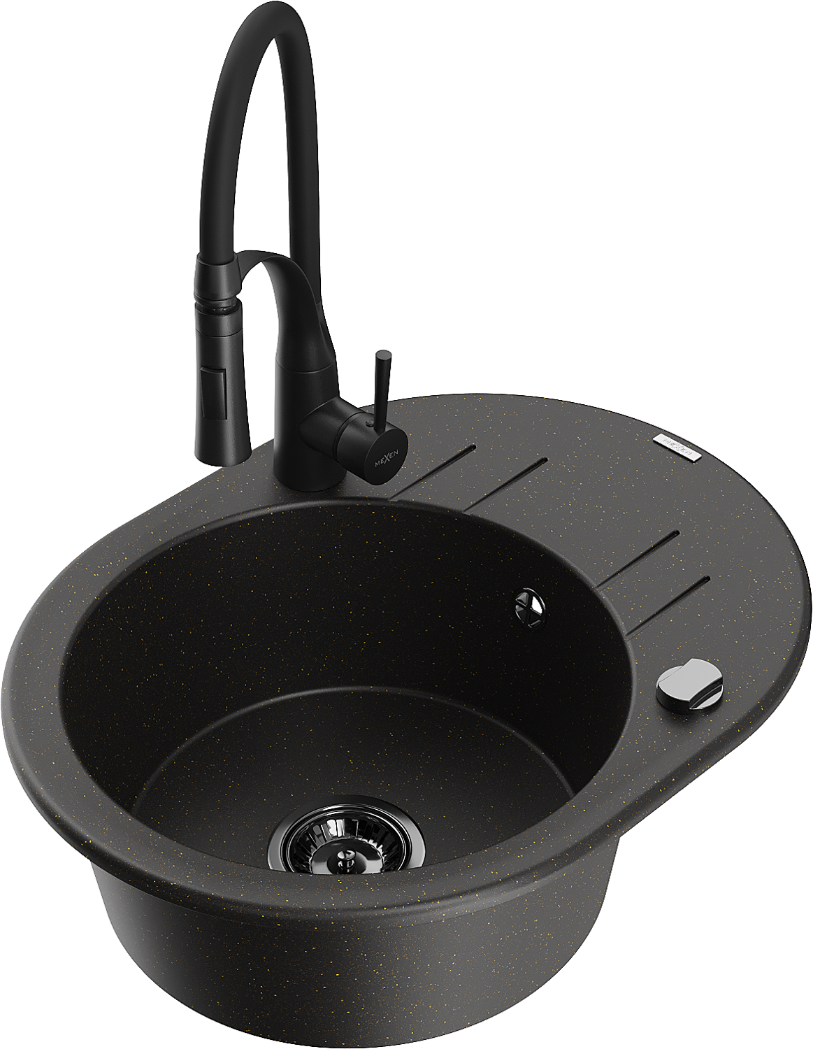 Mexen Kevin granitinė vienos kameros kriauklė su nusausintuvu ir virtuvės maišytuvu Aster, juoda/auksinis metalo blizgesys