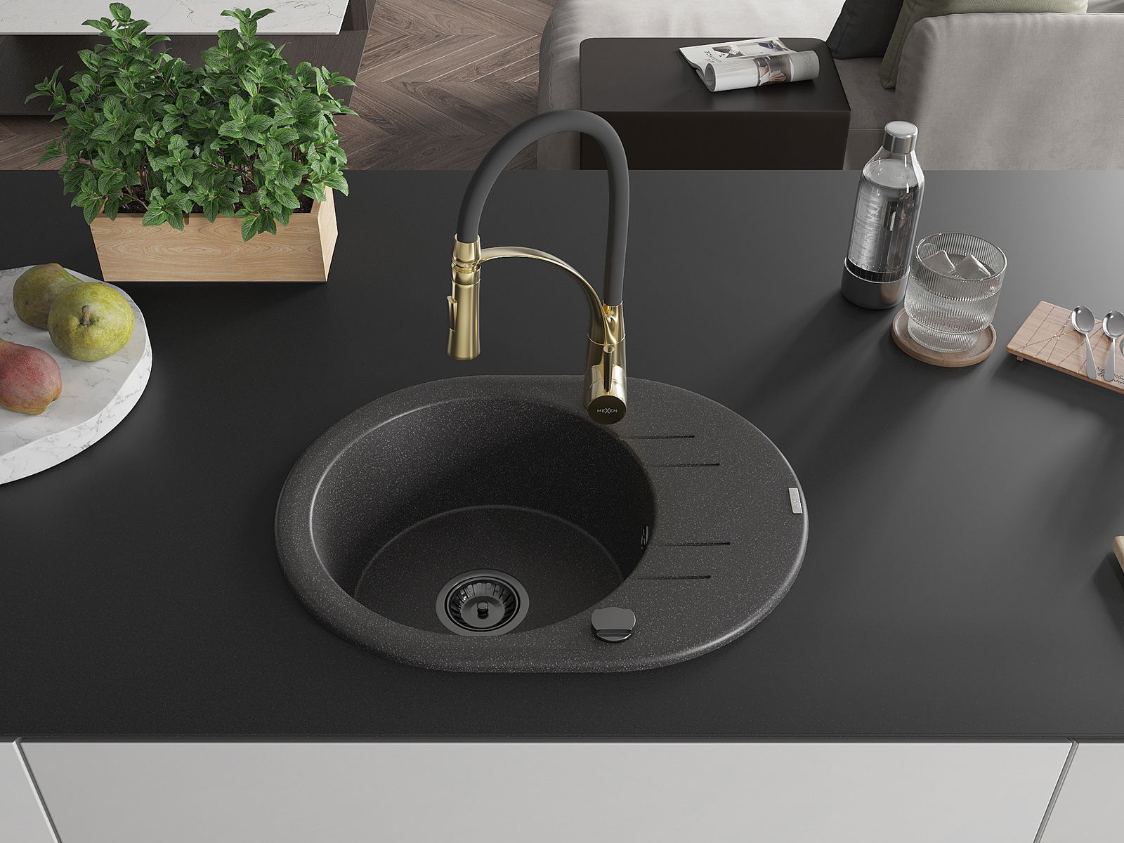 Mexen Kevin 1 dubenų granitinė plautuvė su nusausintuvu ir virtuvės maišytuvu Aster, juoda taškuota - 6517-76-73450-57-B