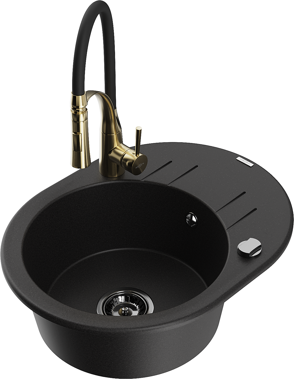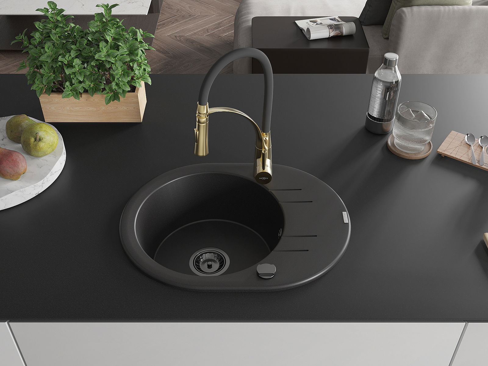 Mexen Kevin granitinė virtuvės kriauklė 1 skyrius su nutekamąja anga ir Aster maišytuvu, juoda - 6517-77-73450-57-B