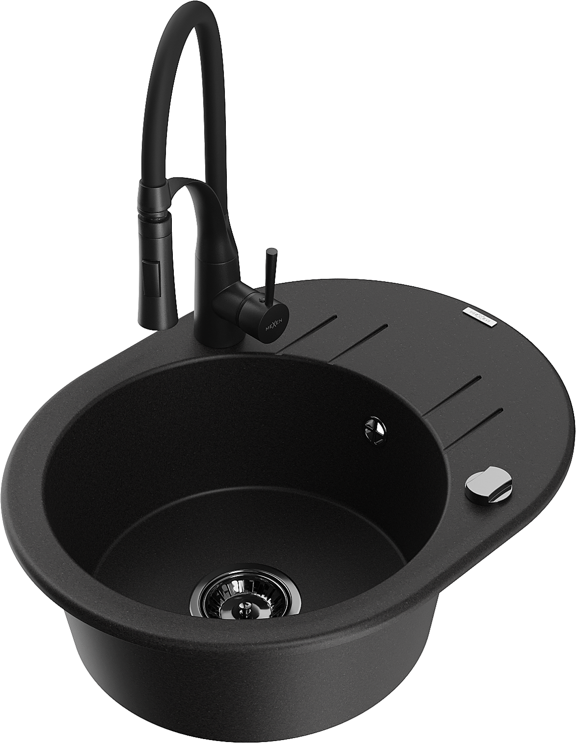 Mexen Kevin granito plautuvė 1-kamerinė su nutekamąja lentele ir virtuviniu maišytuvu Aster, juoda - 6517-77-73450-70-B