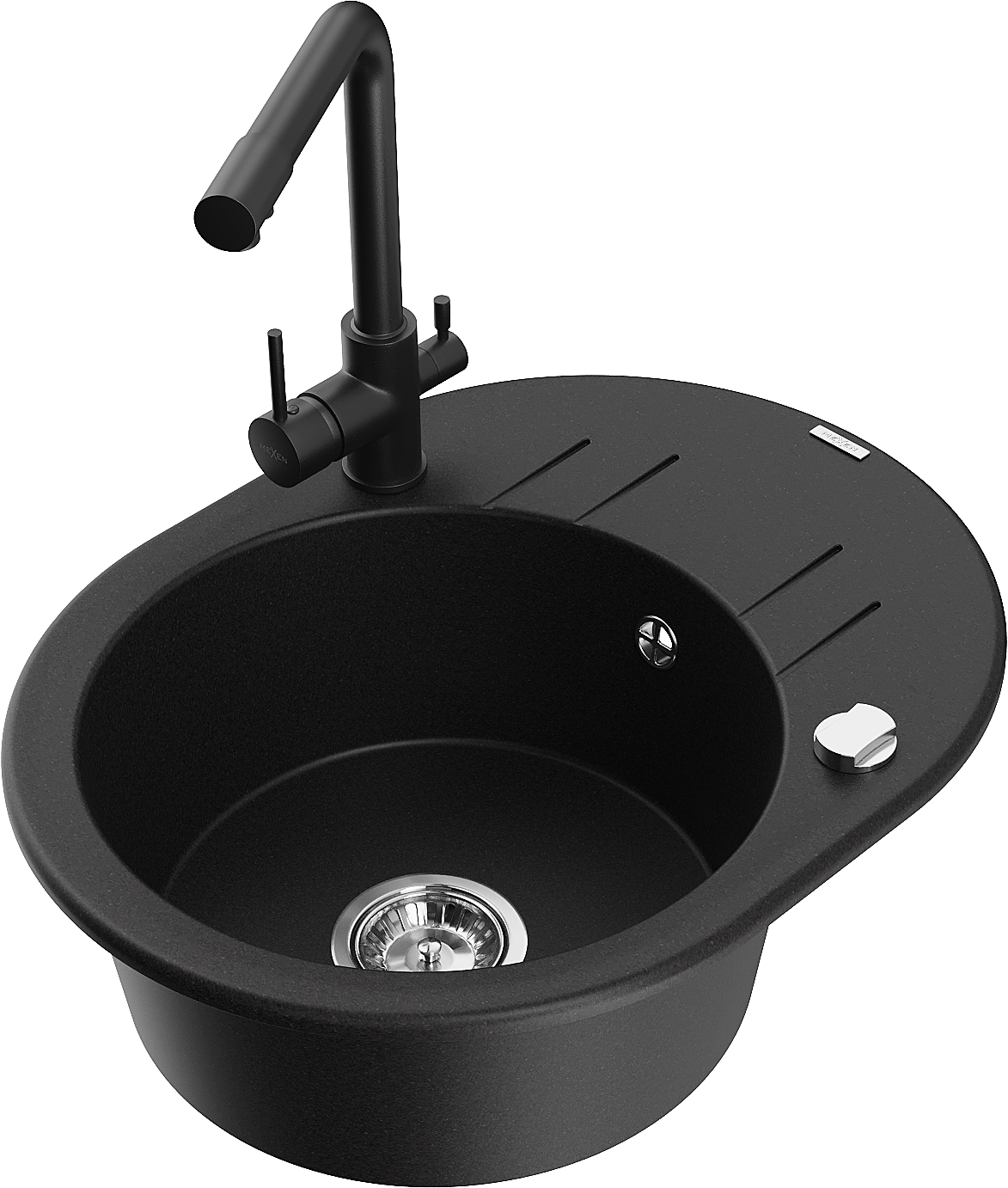 Mexen Kevin granito kriauklė vienos kameros su nutekamuoju ir virtuvės maišytuvu Duero, juoda - 6517-77-671600-70