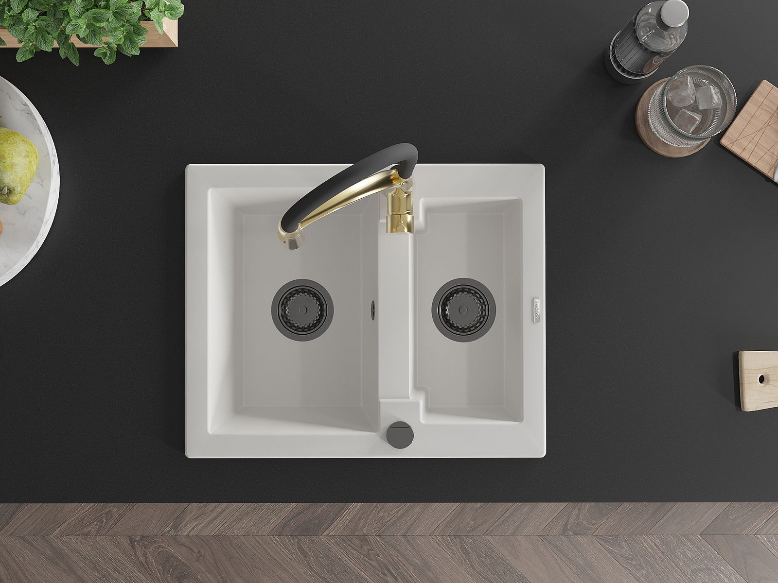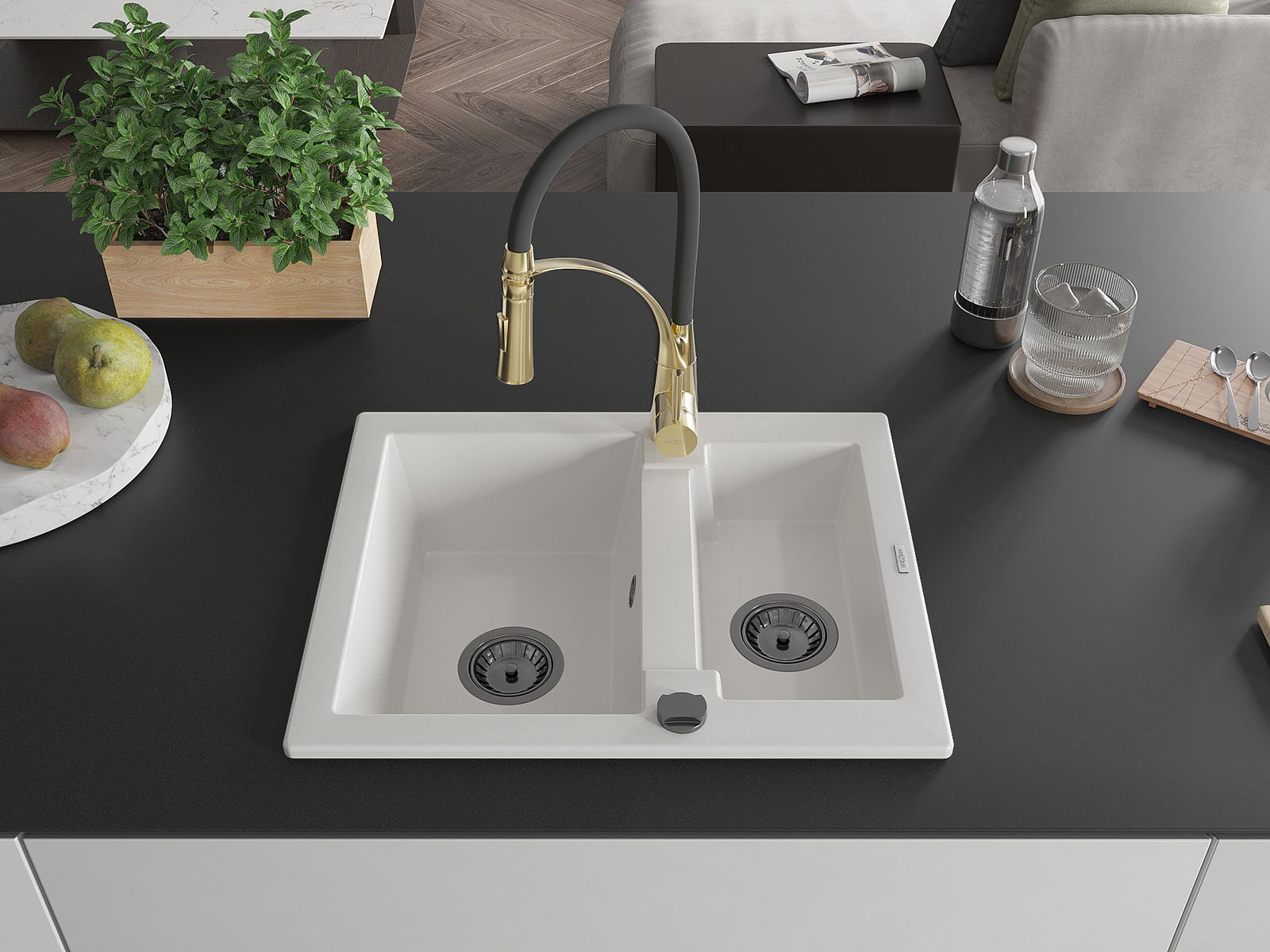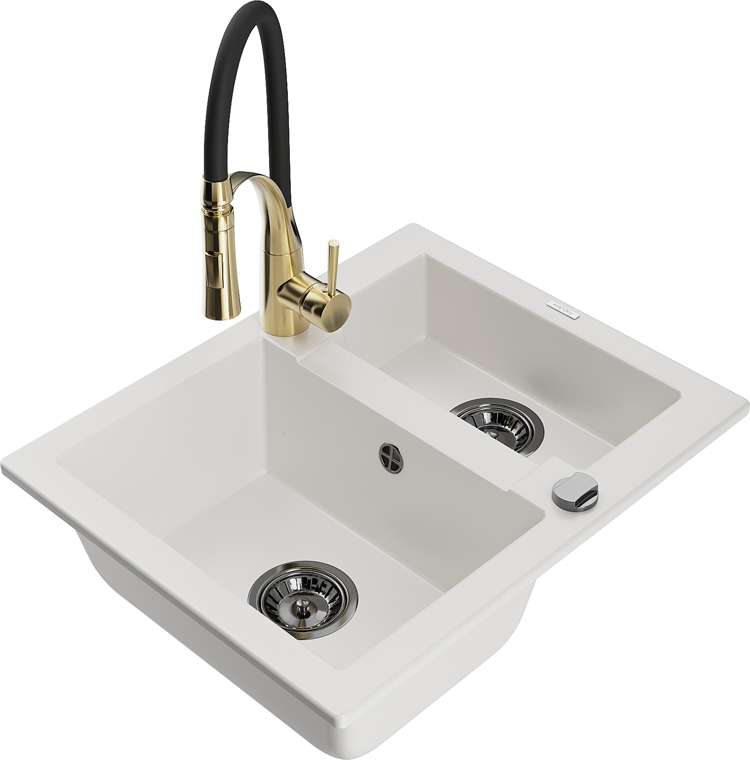 Mexen Carlos granitinė 1,5 skylių plautuvė su virtuviniu maišytuvu Aster, balta - 6518-20-73450-57-B