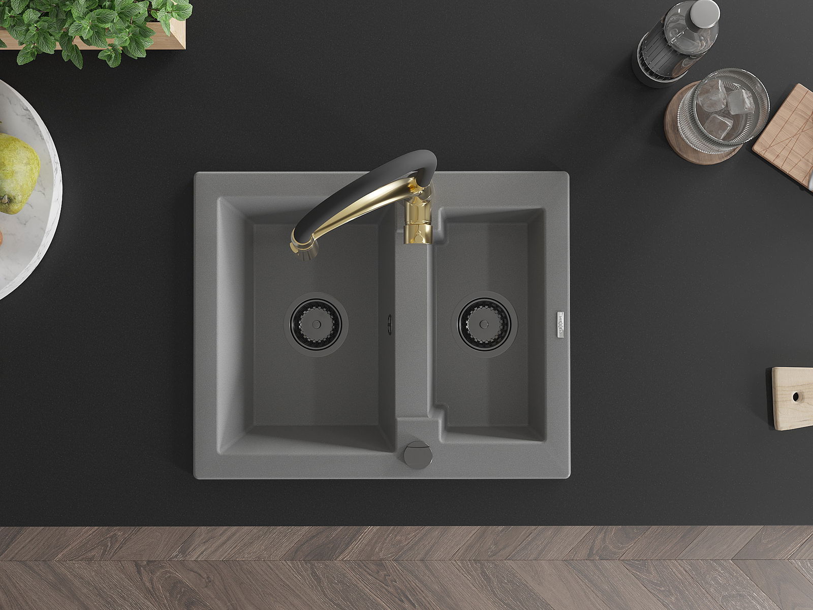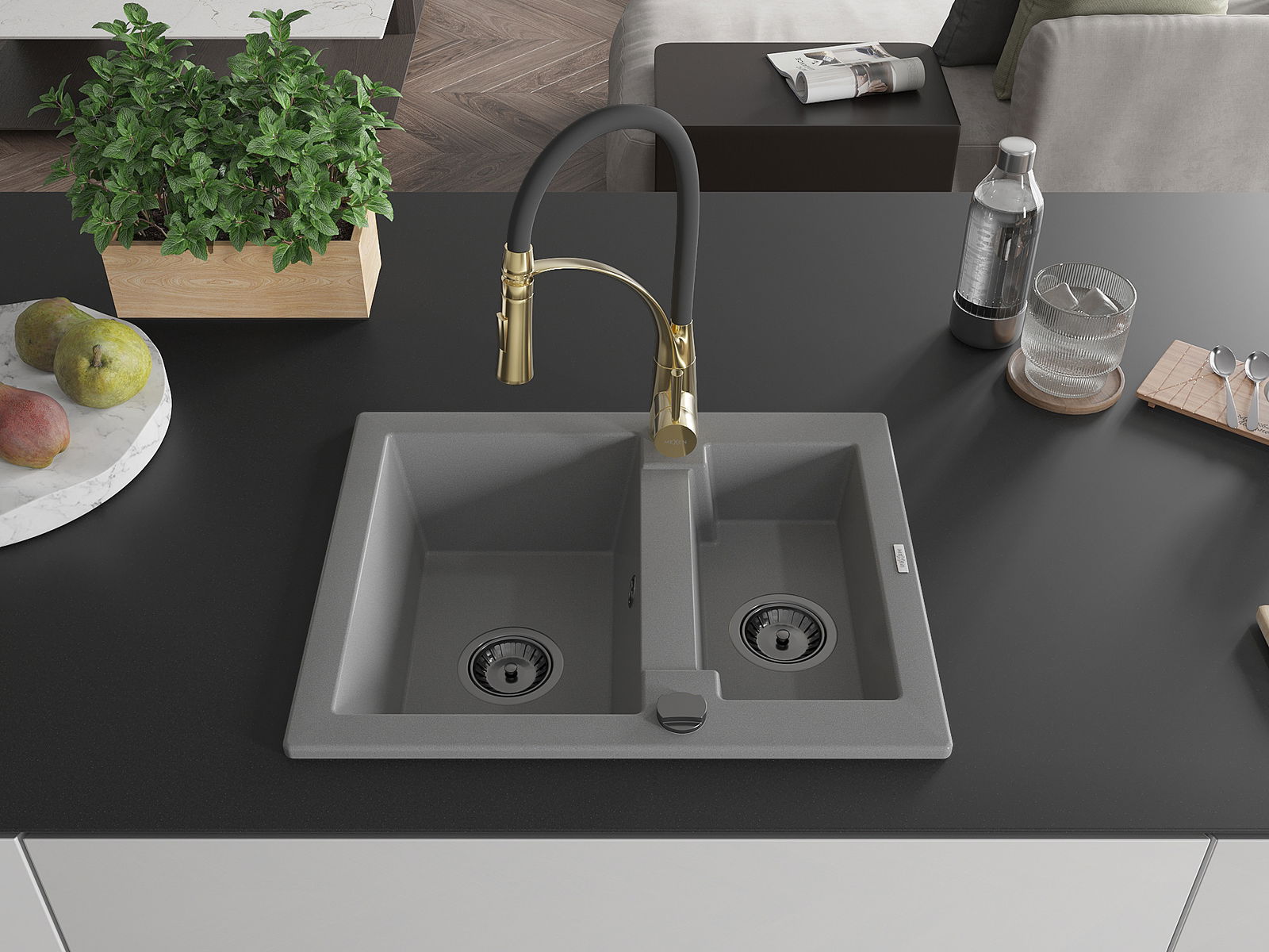 Mexen Carlos granito virtuvės plautuvė 1,5 dubenų su Aster virtuviniu maišytuvu, pilka - 6518-71-73450-57-B