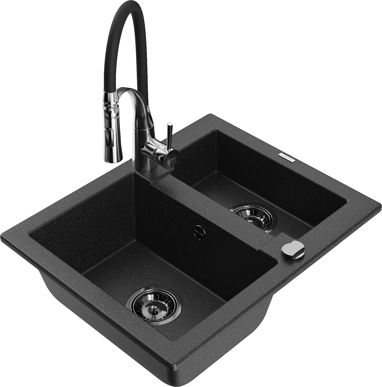 Mexen Carlos granitinė kriauklė 1,5 skylių su virtuviniu maišytuvu Aster, juoda/sidabrinė metalo spalva - 6518-73-73450-07-B