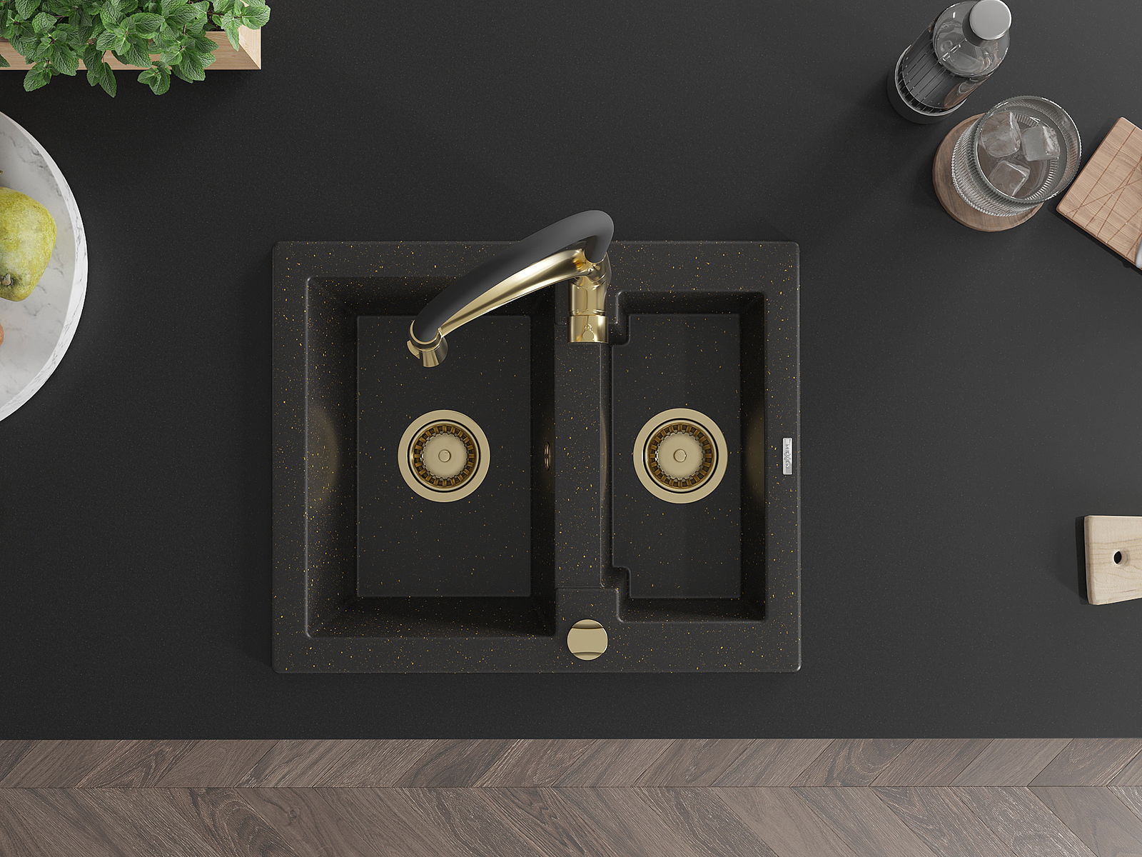 Mexen Carlos granitinis plautuvas 1,5-sekcijos su virtuviniu maišytuvu Aster, juodas/auksinis metalikas - 6518-75-73450-57-G