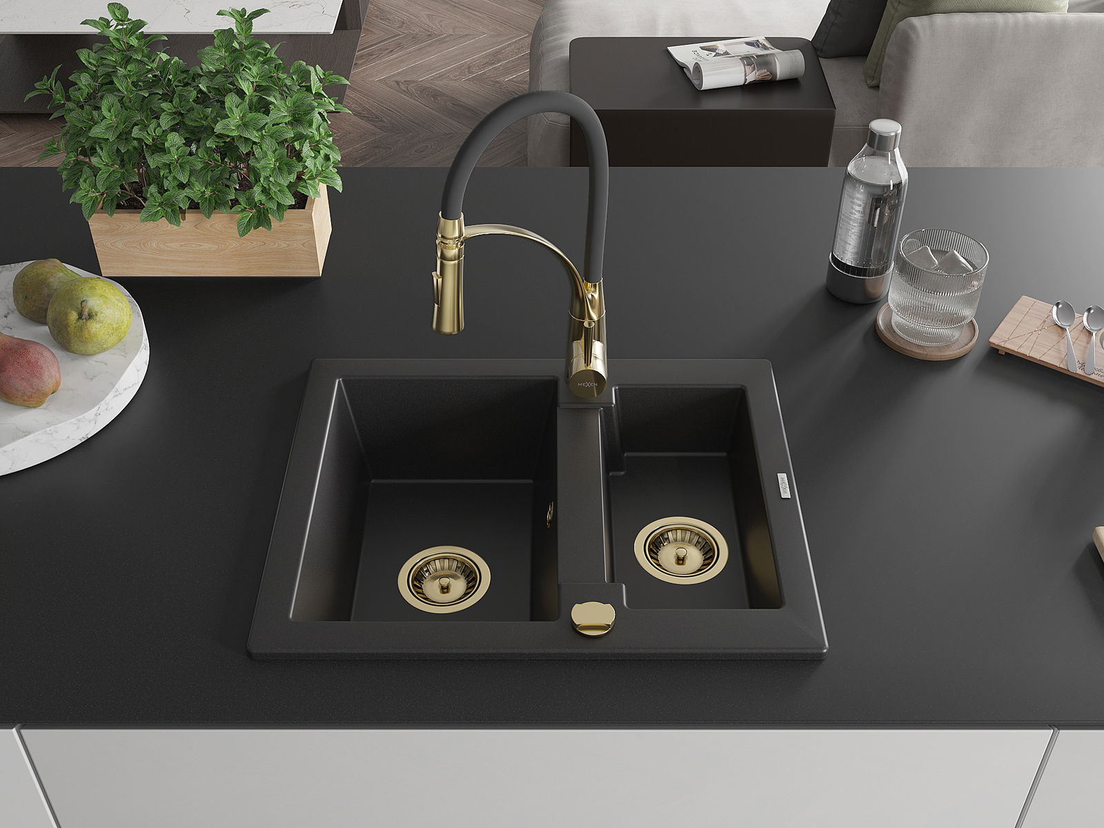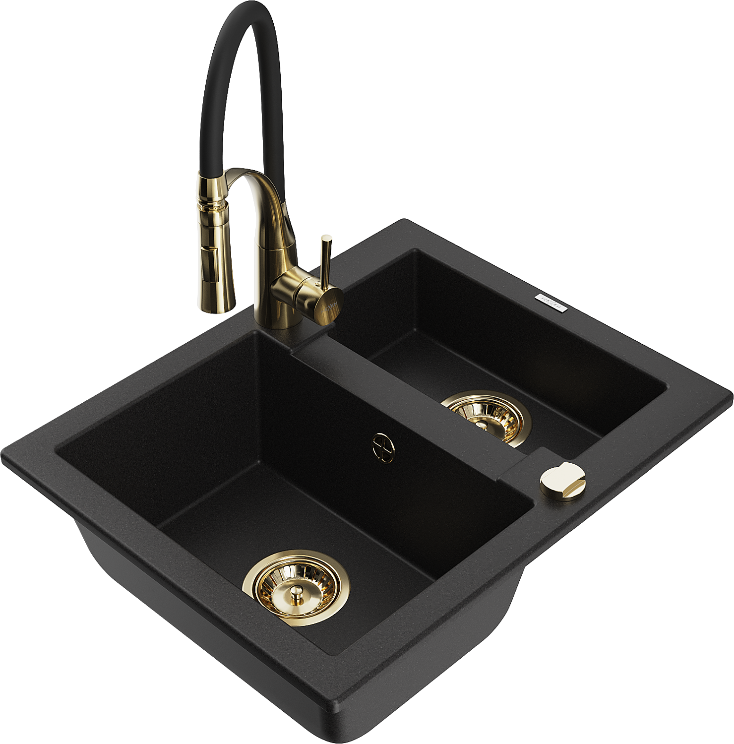Mexen Carlos granitinė 1,5 kamerų kriauklė su virtuviniu maišytuvu Aster, juoda - 6518-77-73450-57-G