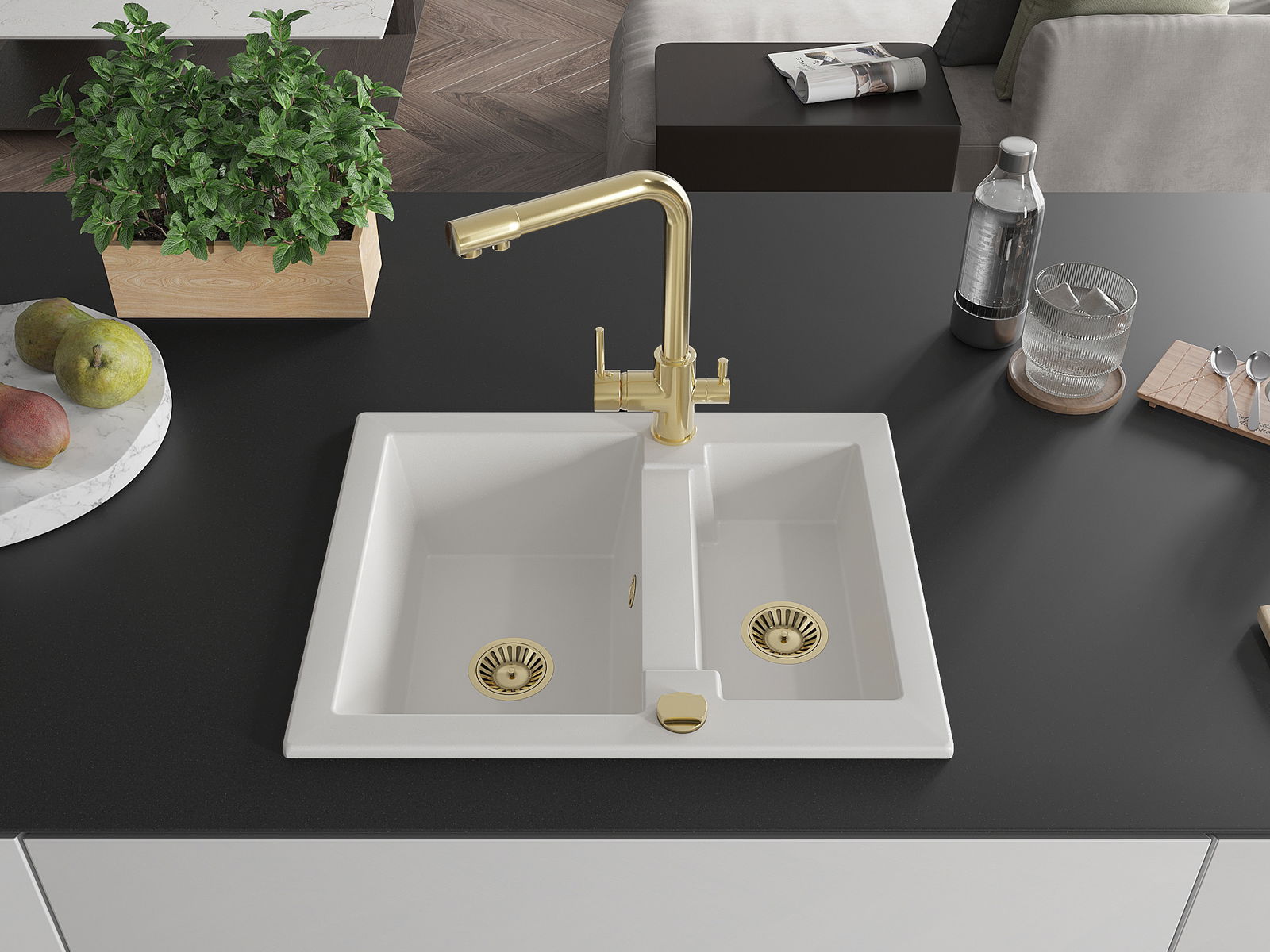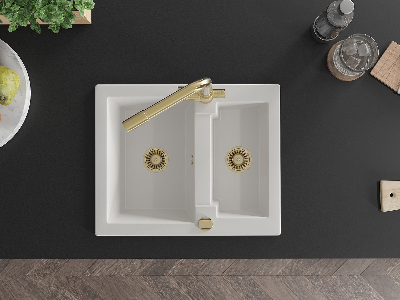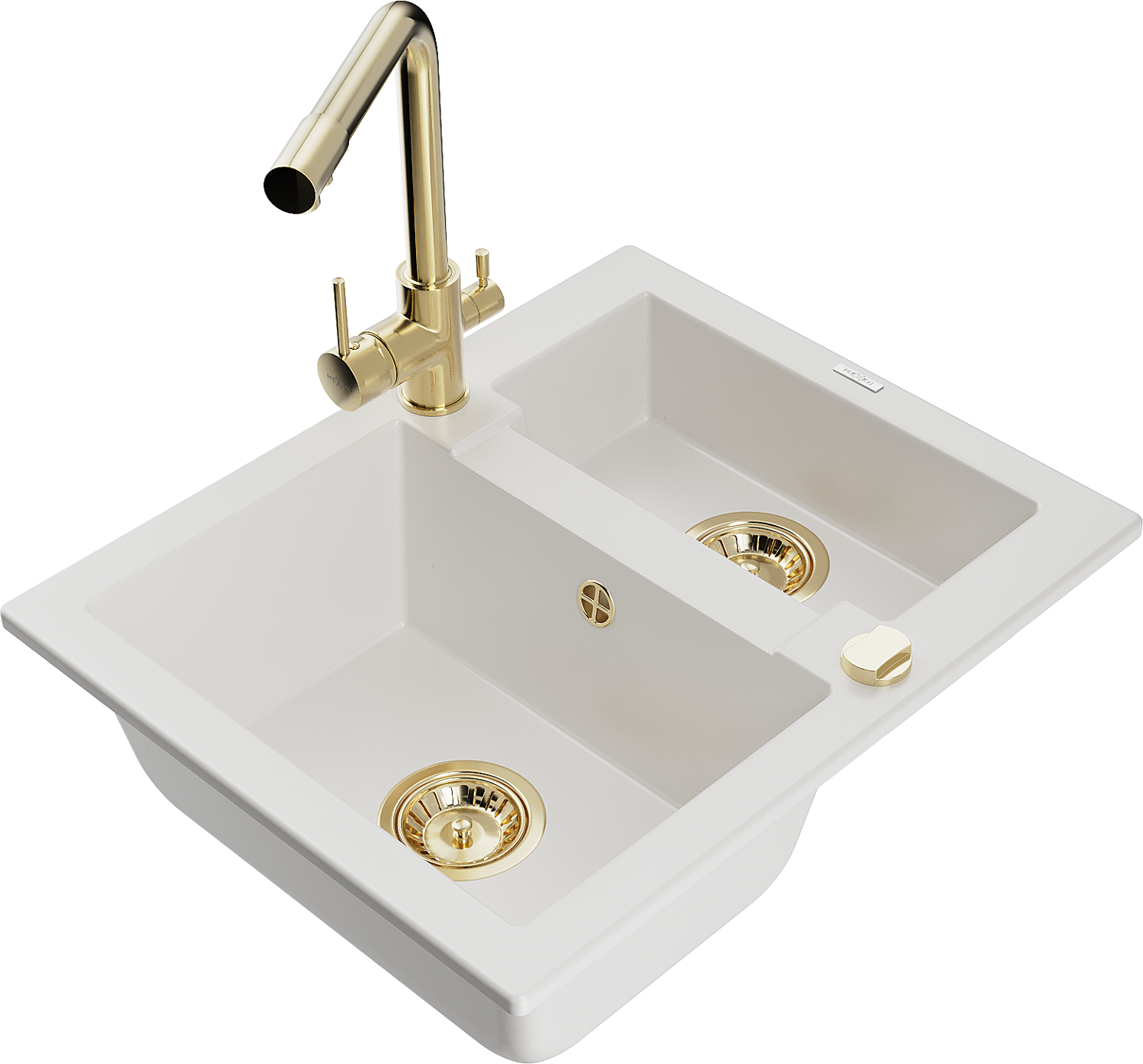 Mexen Carlos granitinis plautuvas 1,5 kamerų su virtuviniu maišytuvu Duero, baltas - 6518-20-671600-50