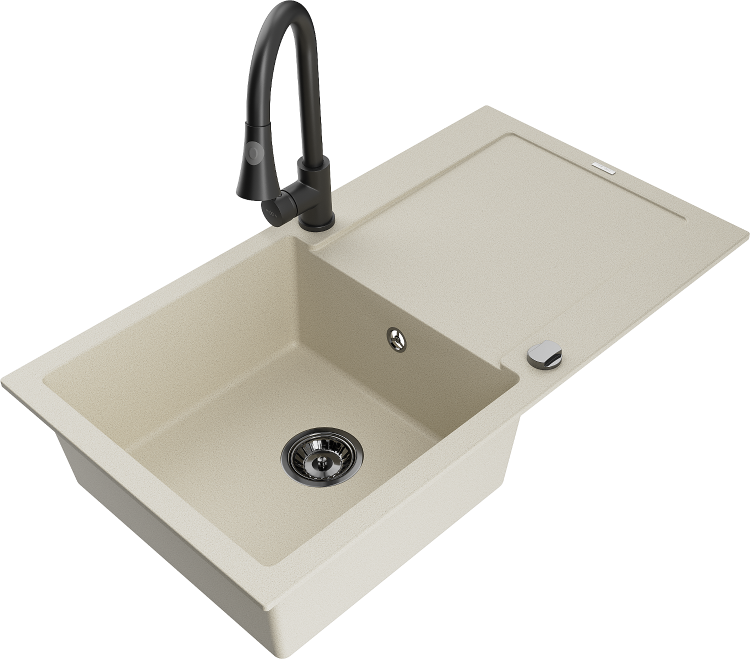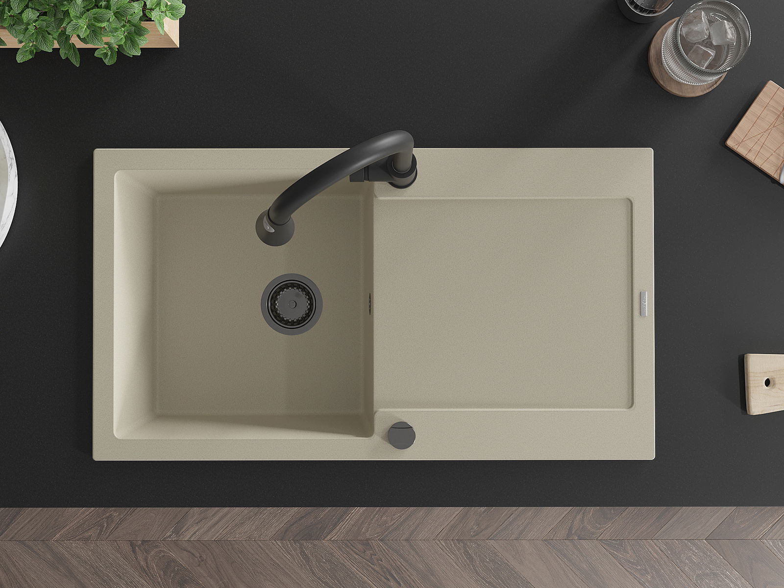 Mexen Leo vienaskyrė granito plautuvė su nutekamu ir virtuviniu maišytuvu Elia, smėlinė - 6501-69-670101-70