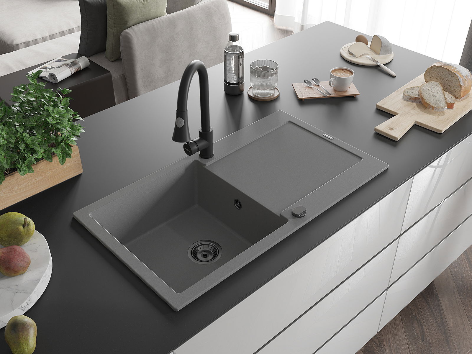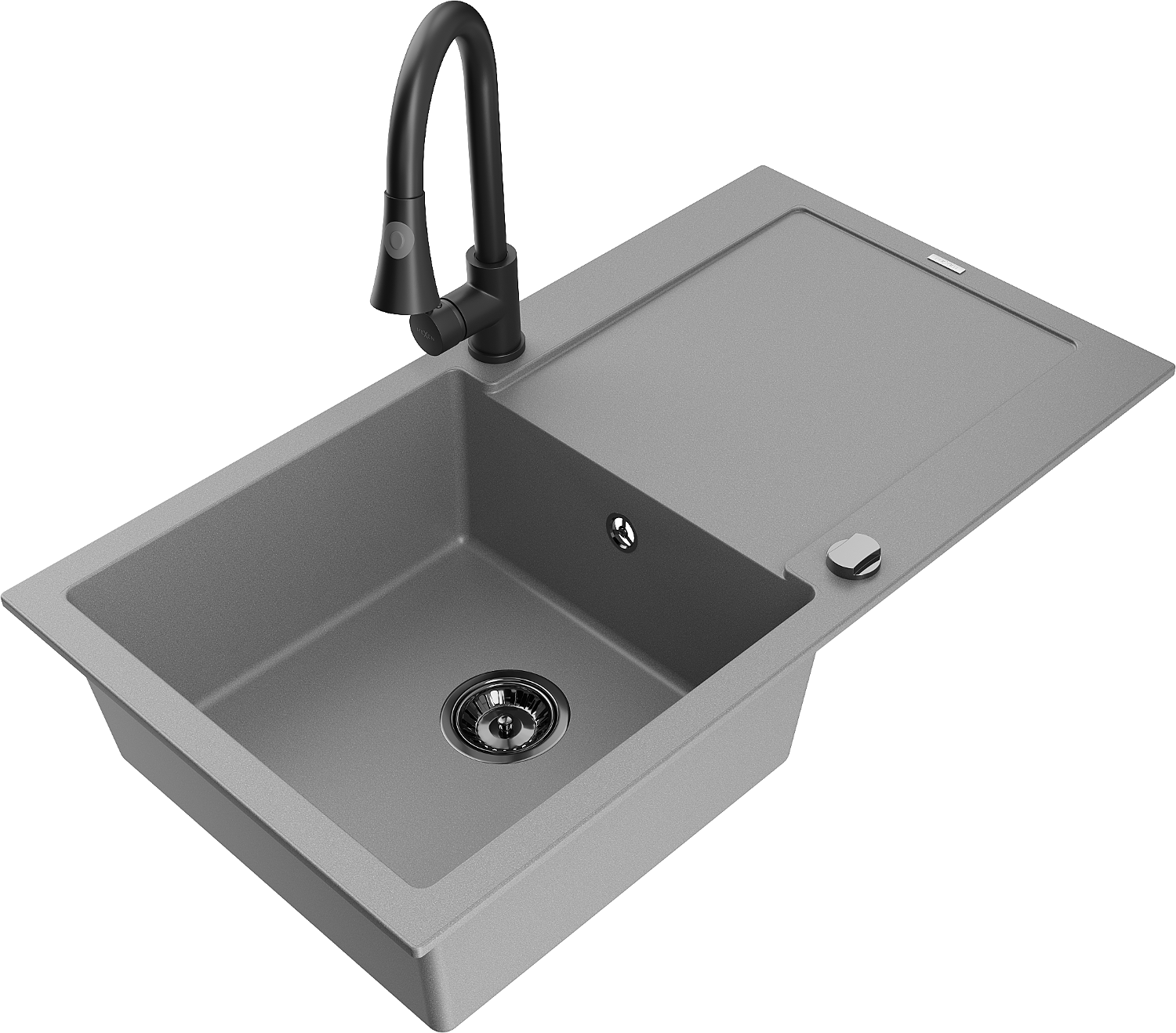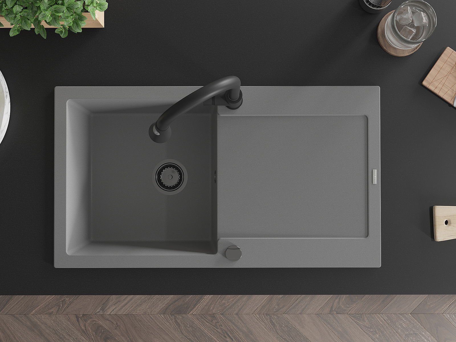 Mexen Leo granito plautuvė 1-komorinis su nusausintuvu ir virtuviniu maišytuvu Elia, pilkas - 6501-71-670101-70-B