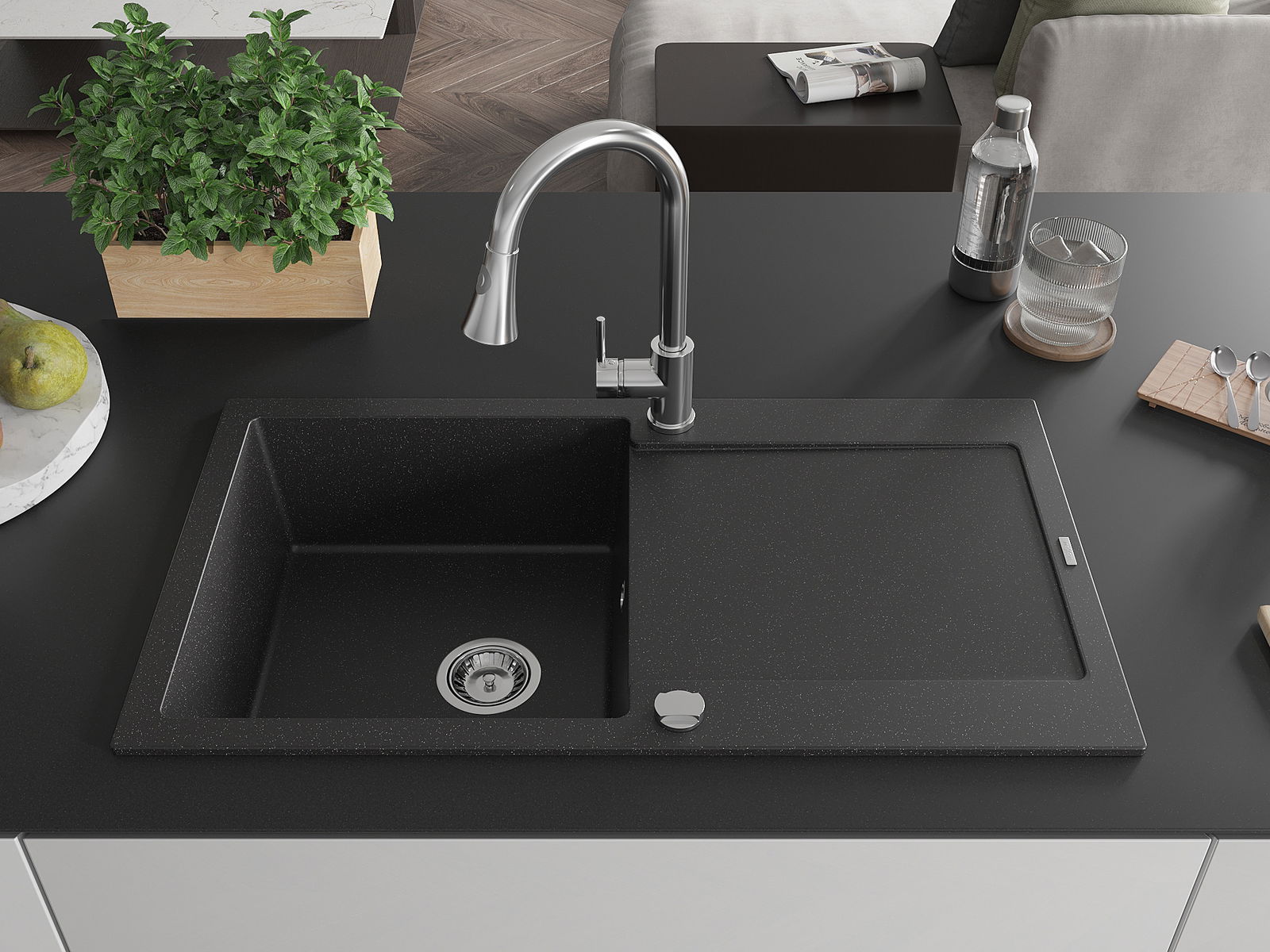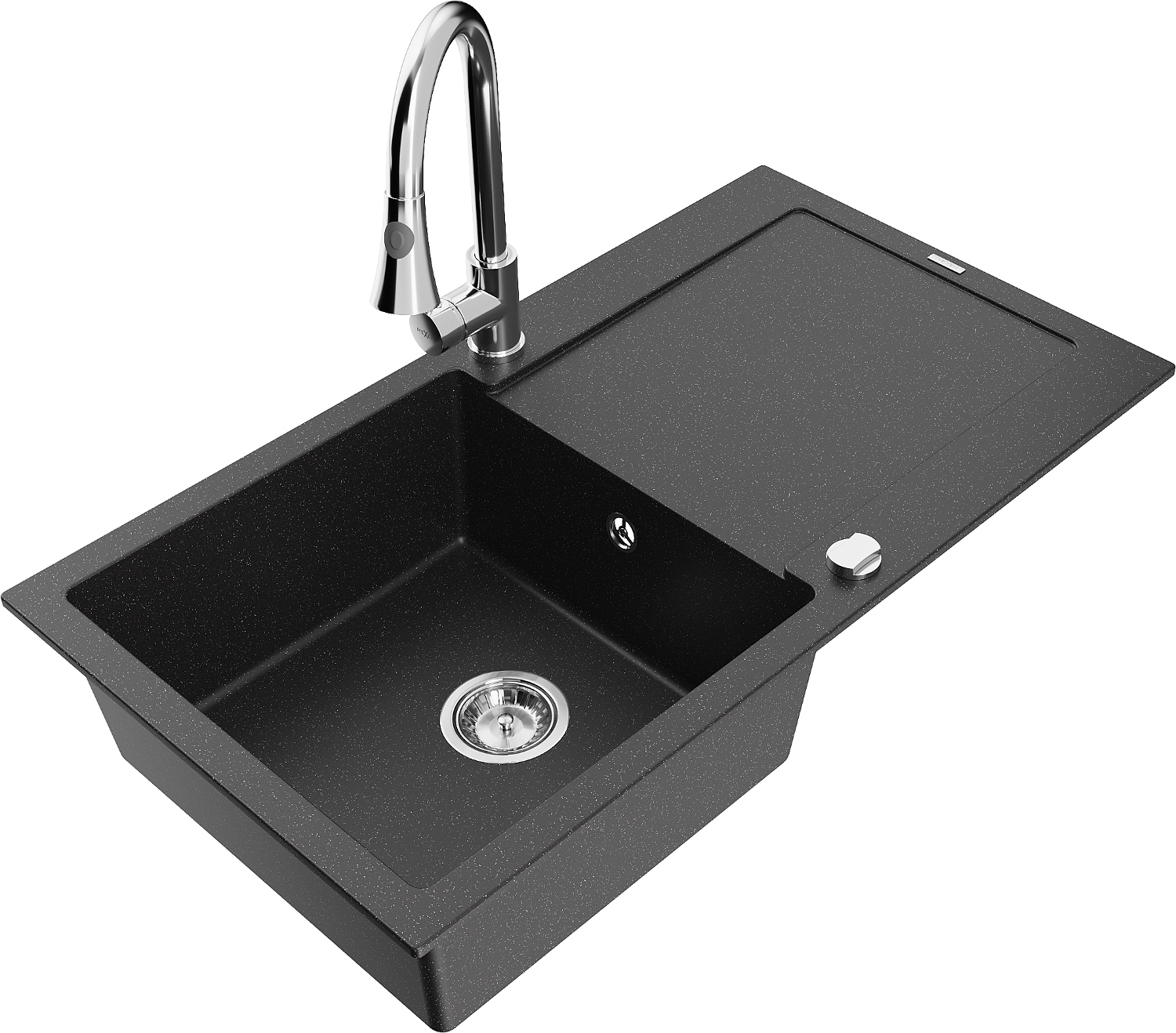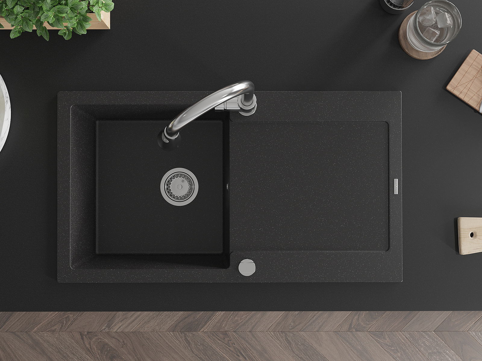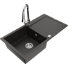 Mexen Leo grindinis vienos kameros praustuvas su nutekamuoju ir virtuviniu maišytuvu Elia, juodas/sidabrinis metalikas