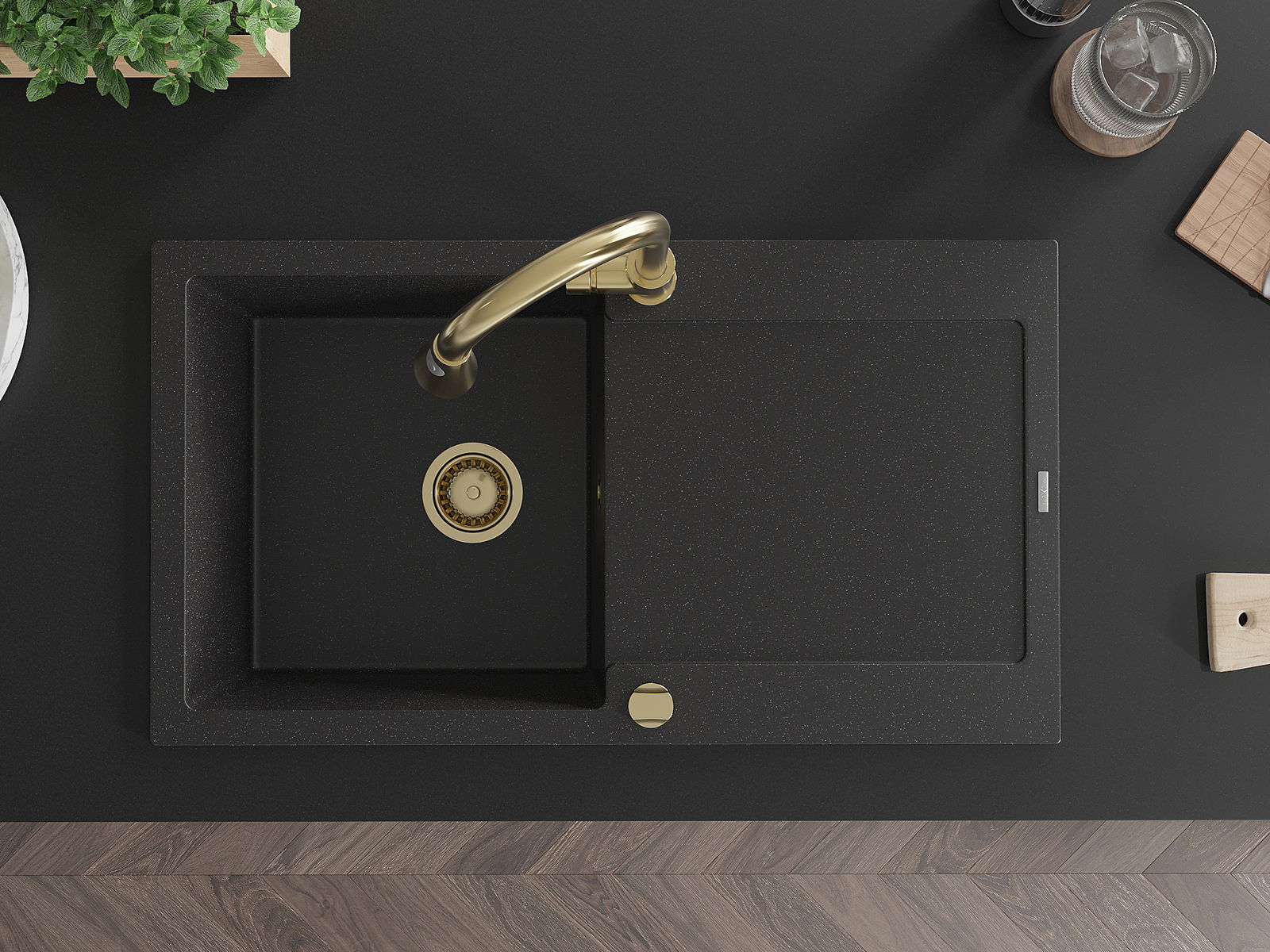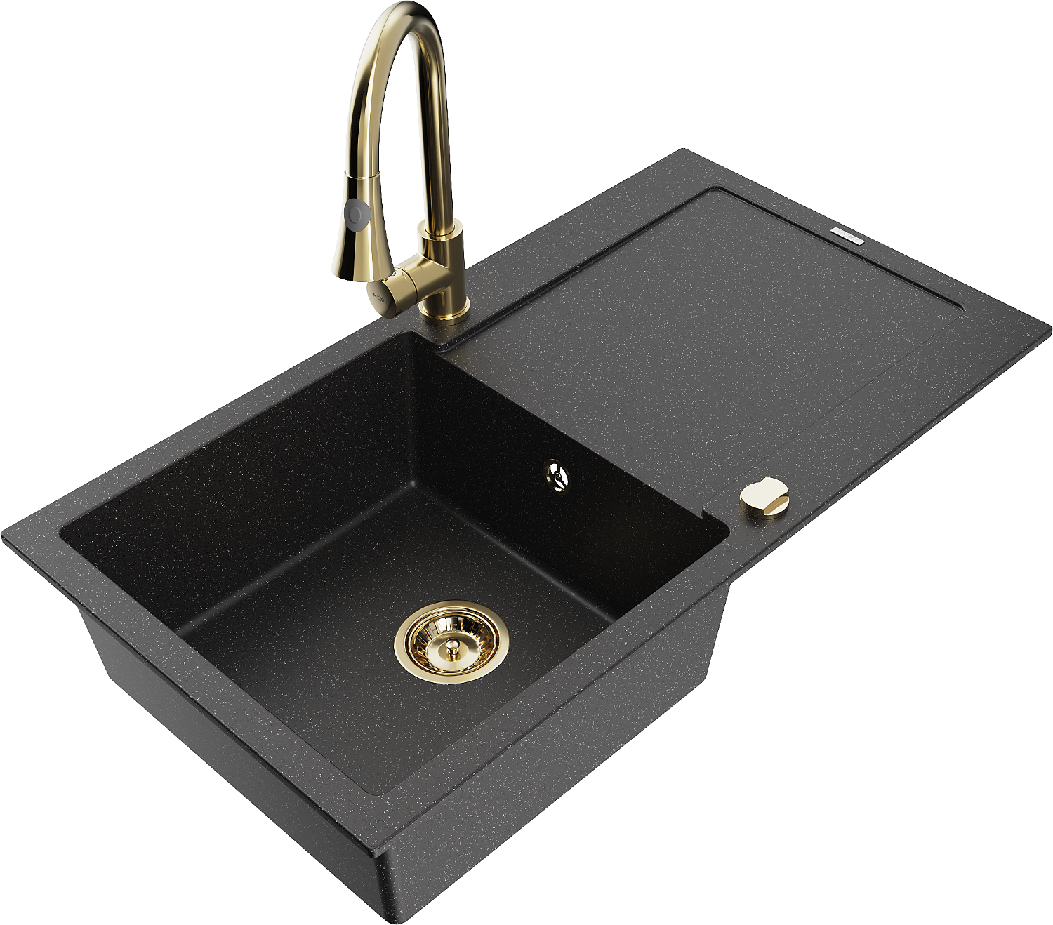 Mexen Leo granitinė vienos skyrelio virtuvės kriauklė su nusausintuvu ir virtuviniu maišytuvu Elia, juoda/sidabrinė
