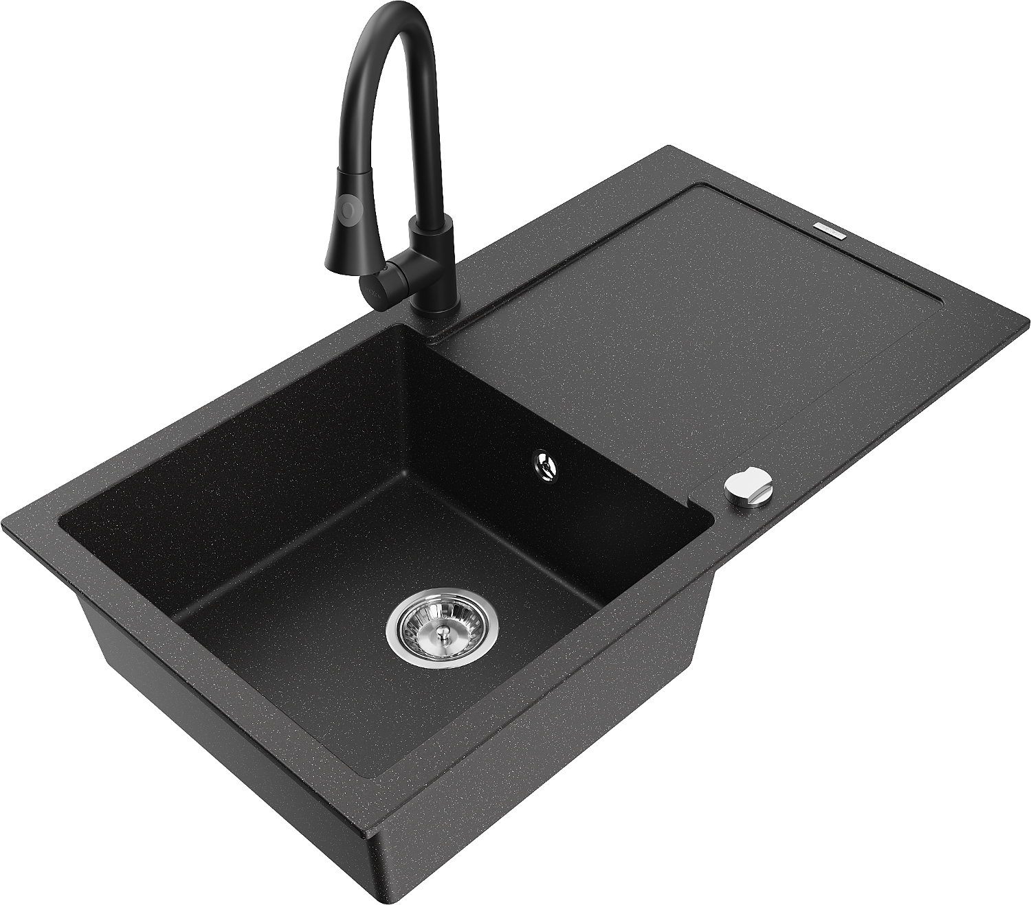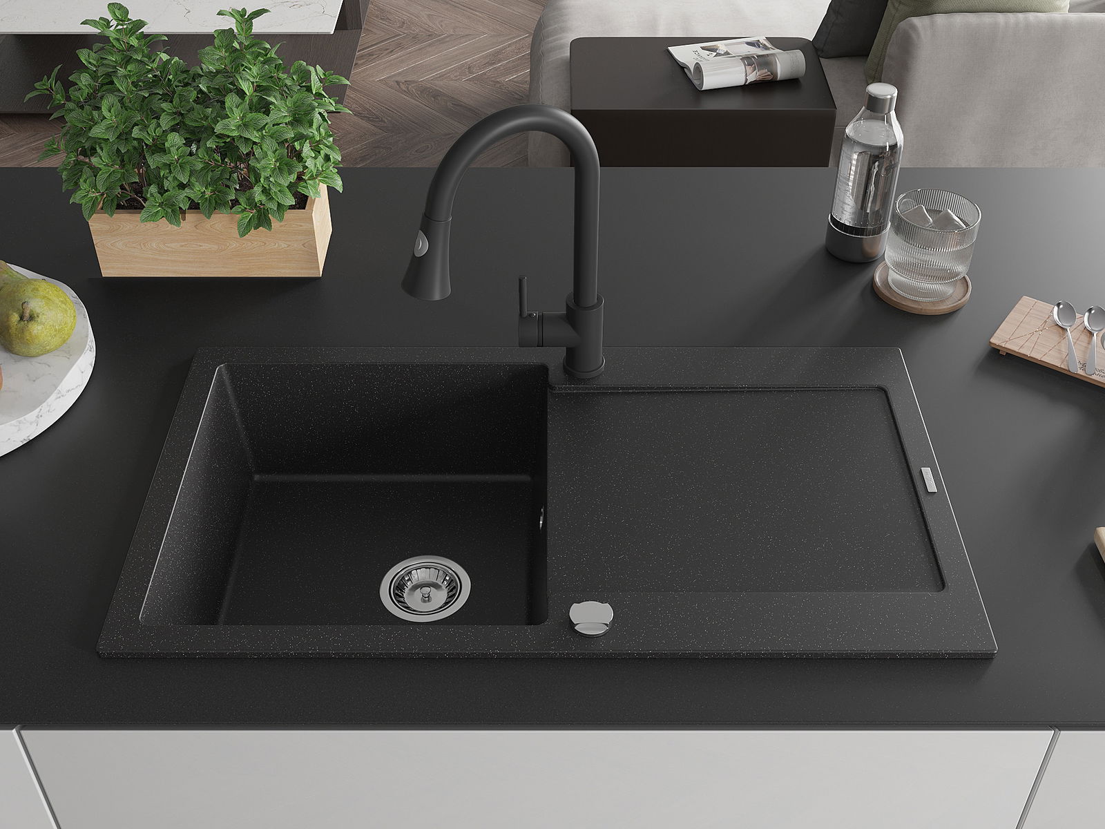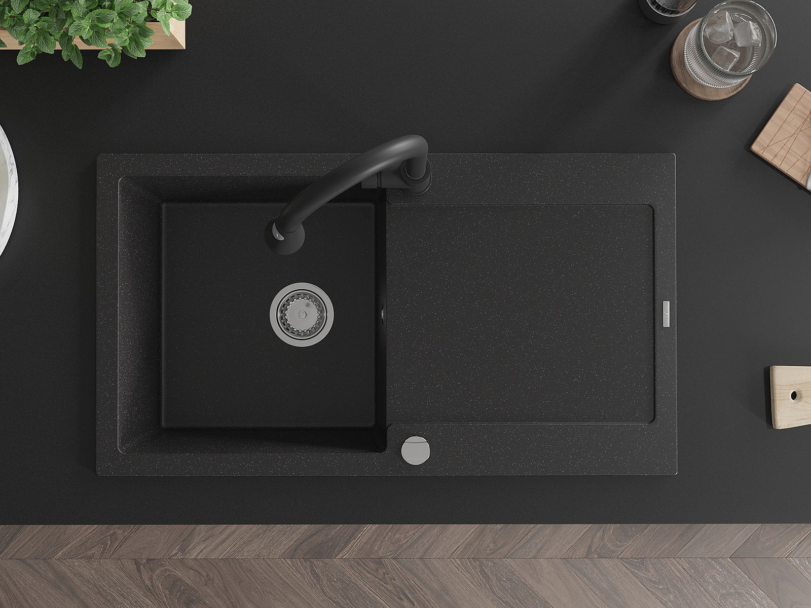 Mexen Leo granitinė virtuvės kriauklė su viena kamera, lašintuvu ir Elia virtuviniu maišytuvu, juoda/sidabrinė metalinė