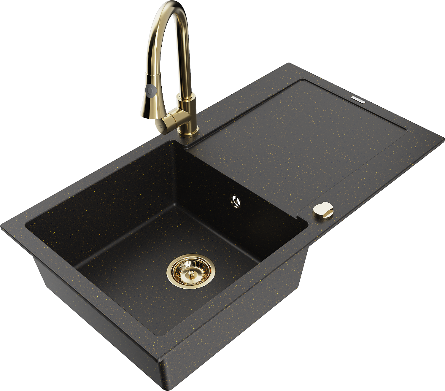 Mexen Leo granitinis virtuvės plautuvas su 1 dubeniu ir nusausintuvu bei virtuvės maišytuvu Elia, juodas/auksinis metalikas - 6?