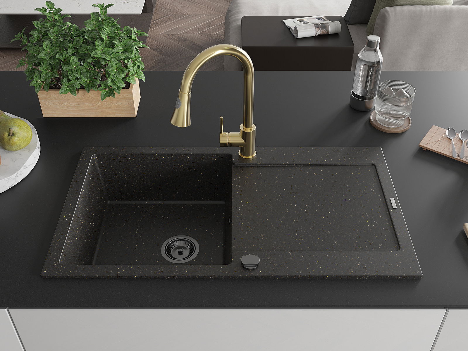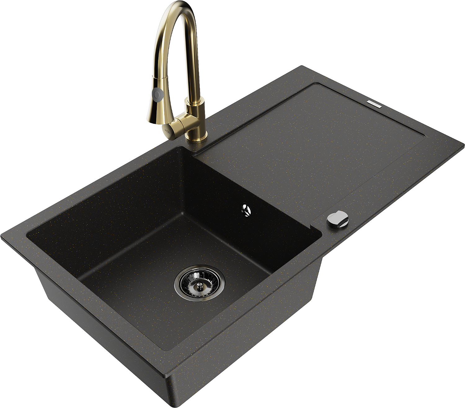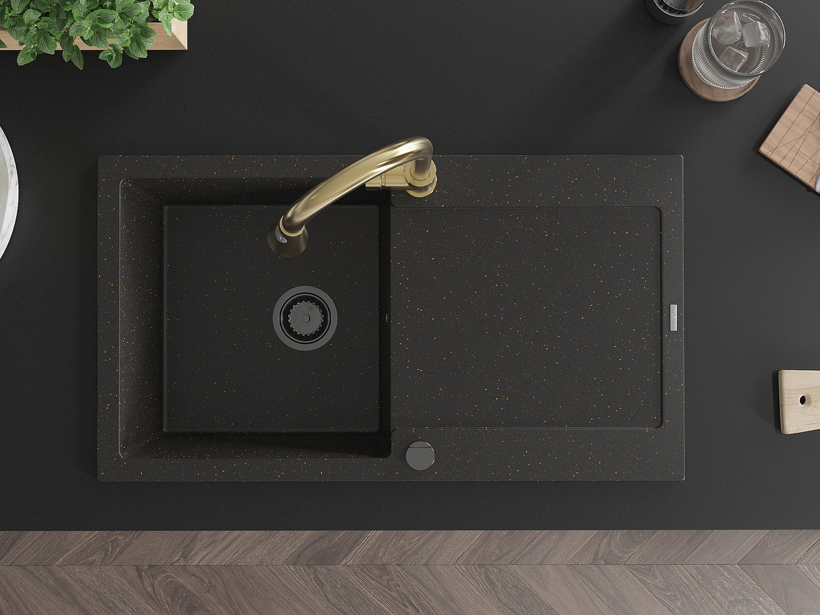 Mexen Leo granitinė vienos plautuvės kriauklė su nusausintuvu ir virtuvės maišytuvu Elia, juoda/aukso spalvos metalik