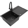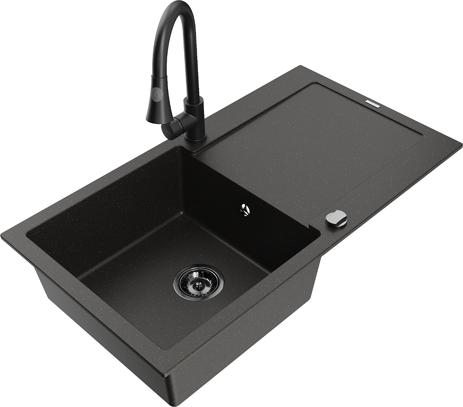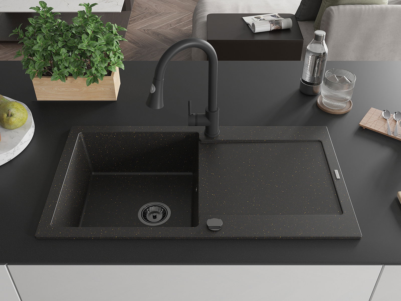 Mexen Leo vienos kameros granitinė kriauklė su nutekamu ir virtuviniu maišytuvu Elia, juoda/auksinė metalika