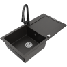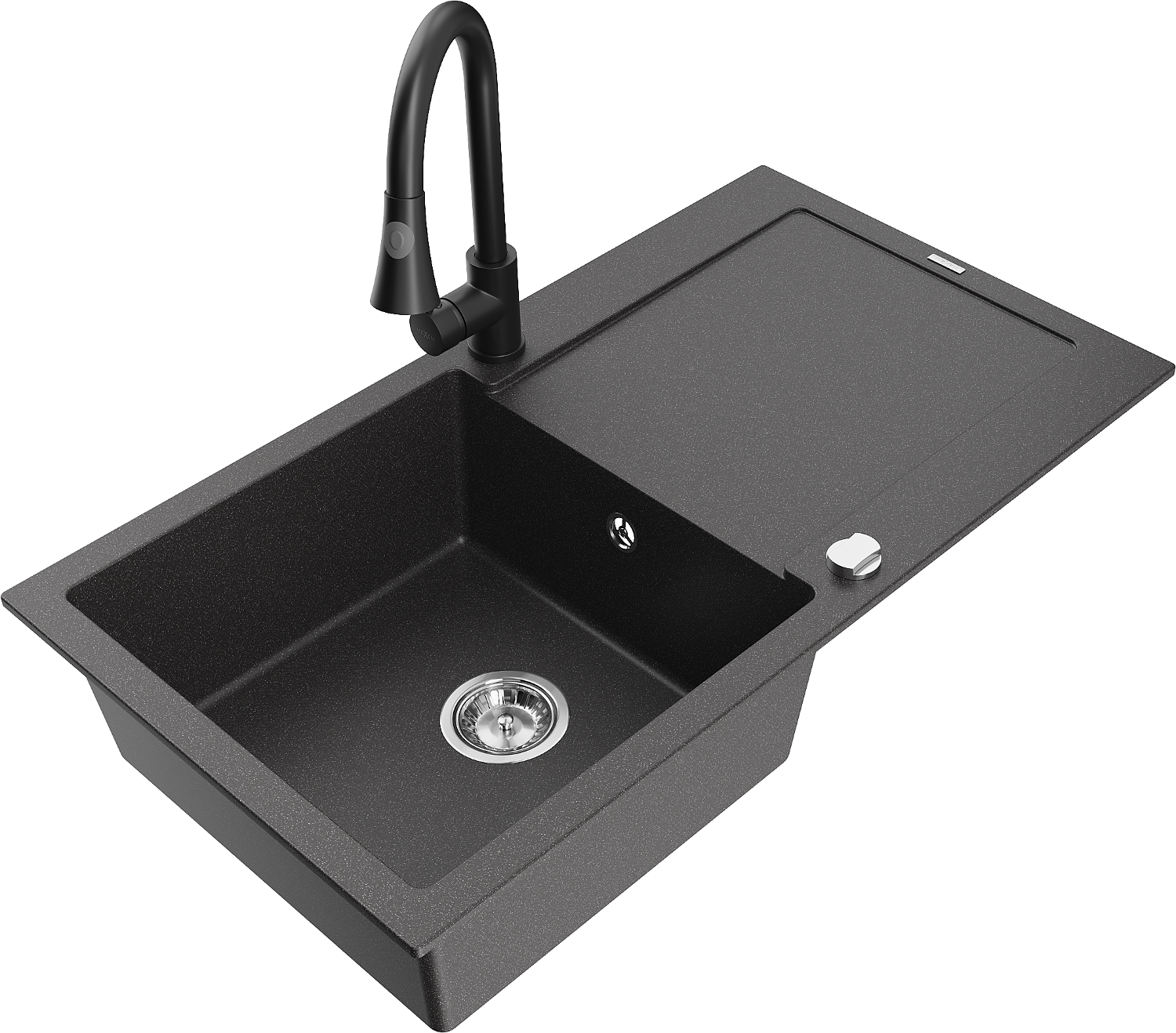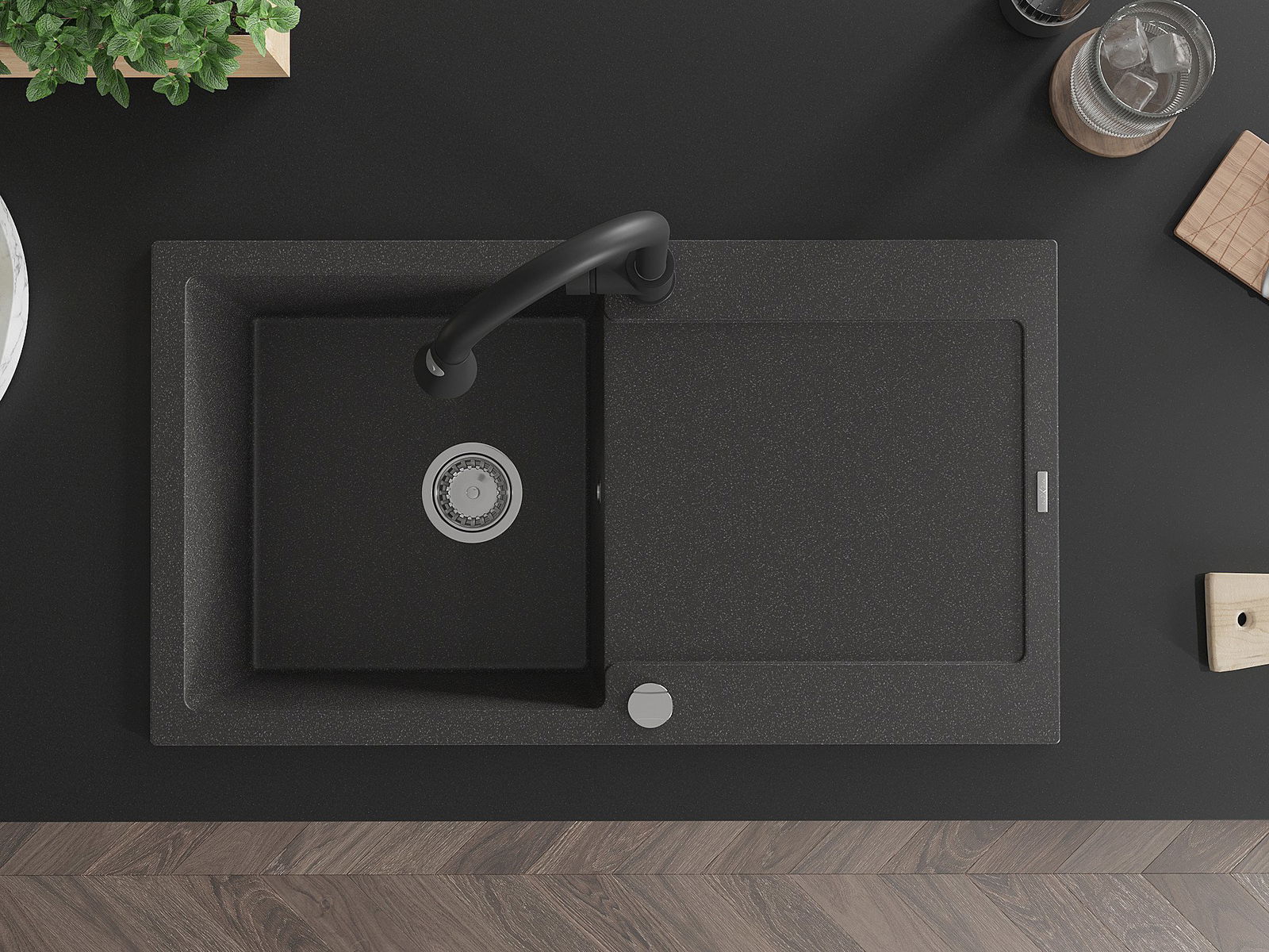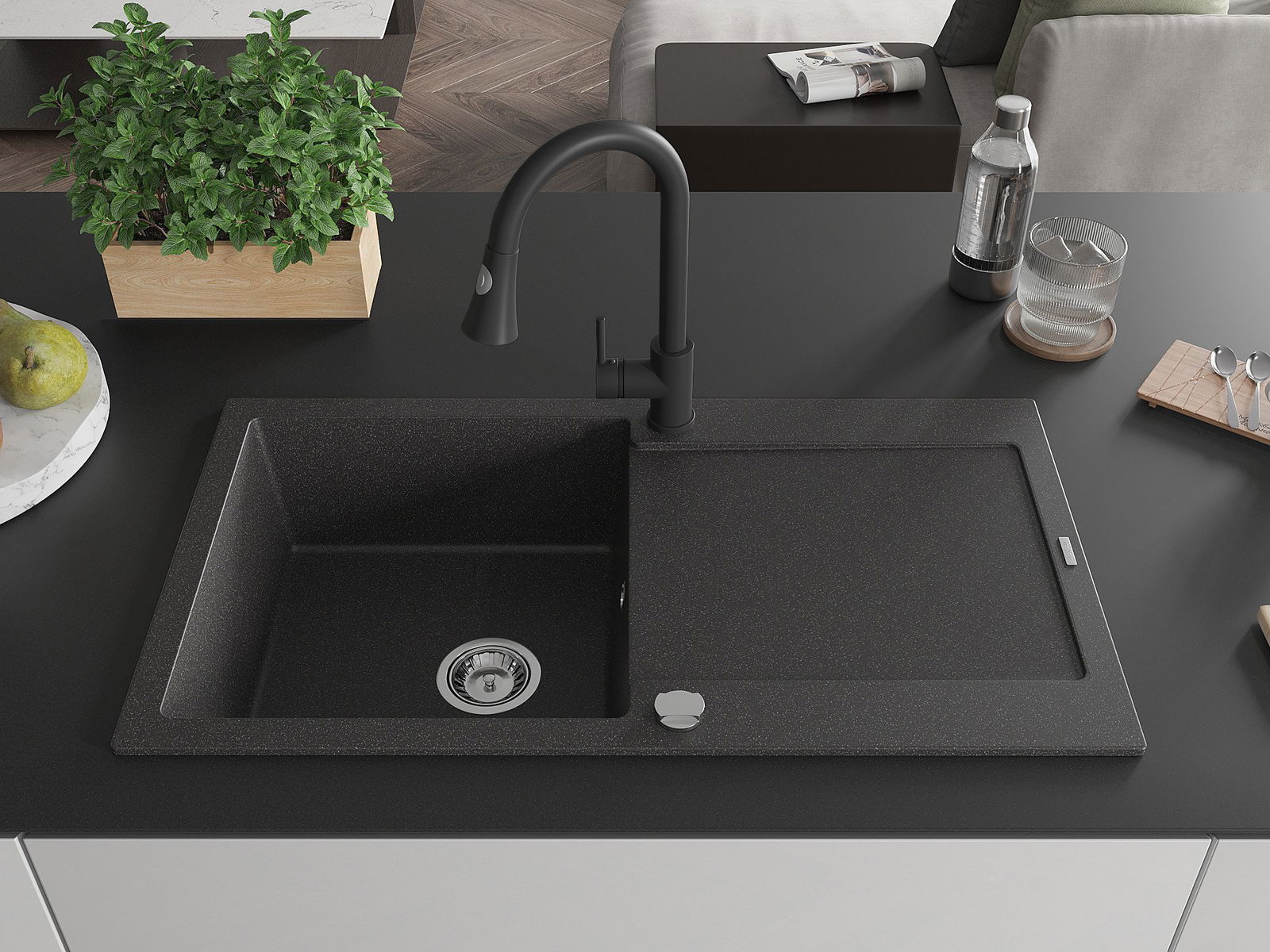 Mexen Leo granitinė vienos kameros plautuvė su nutekėjimu ir virtuviniu maišytuvu Elia, juodas taškuotas