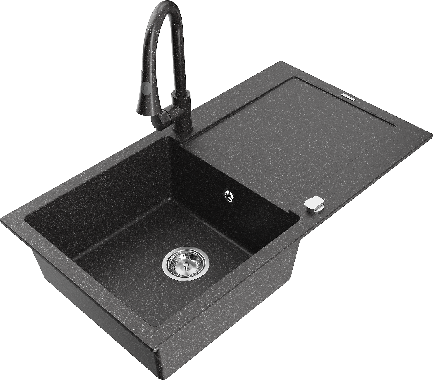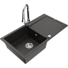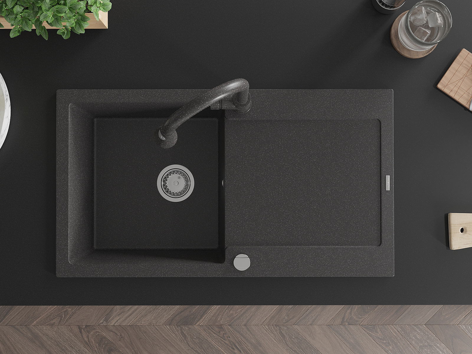 Mexen Leo granitinė vienos kameros plautuvė su nuvarvėjimo lentyna ir virtuviniu maišytuvu Elia, juodos spalvos su