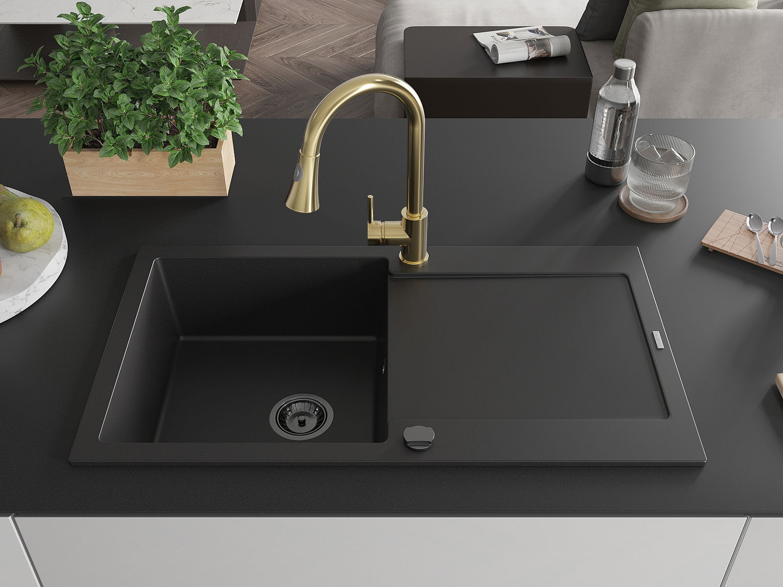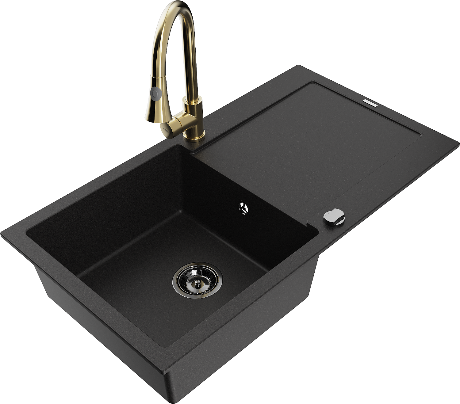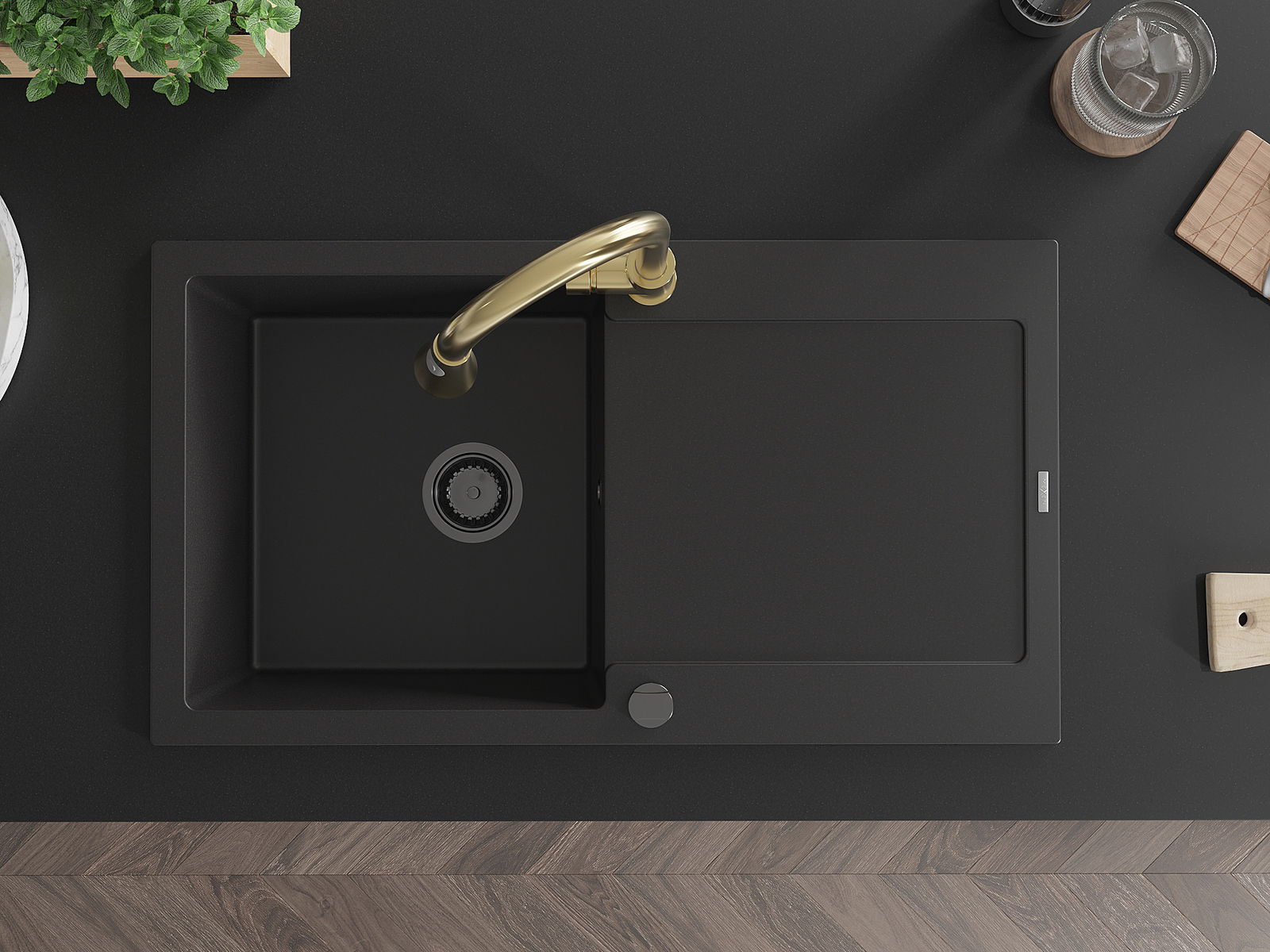 Mexen Leo granitinis virtuvės kriauklė 1-komorė su drenažu ir virtuvės maišytuvu Elia, juoda - 6501-77-670101-50-B