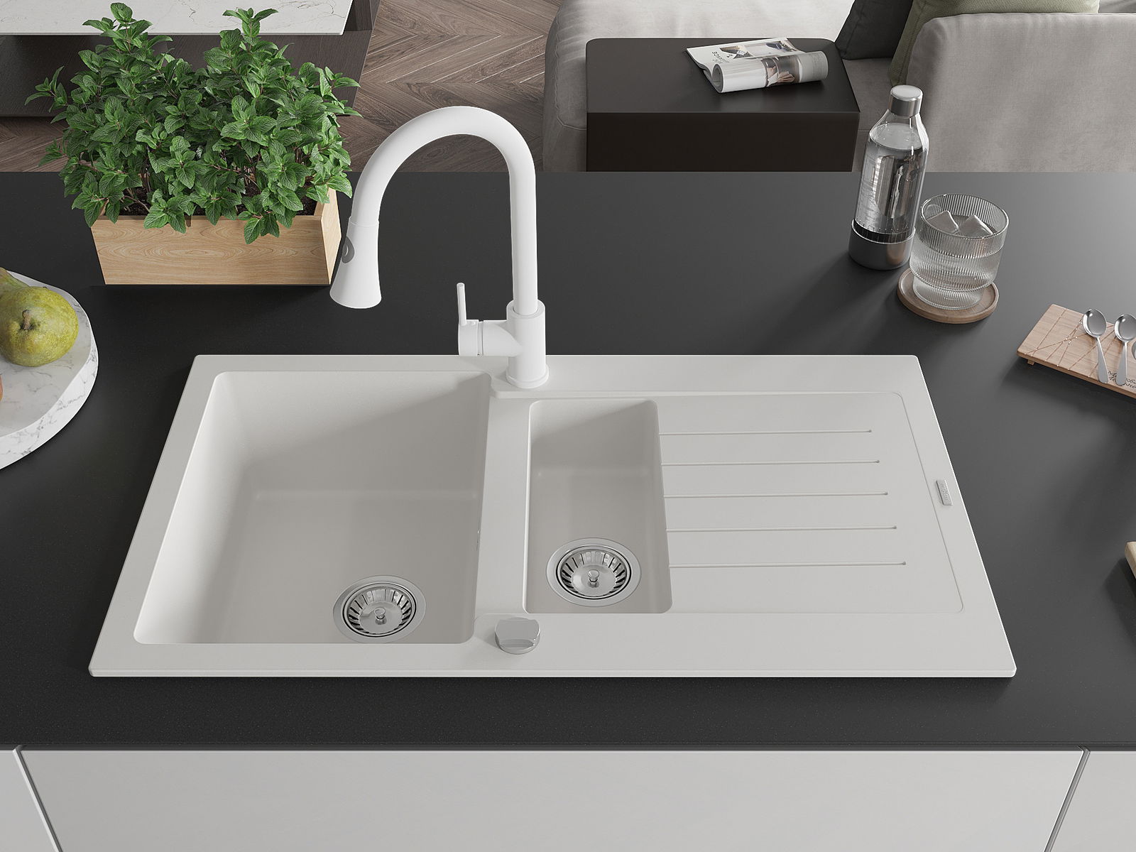 Mexen Matias granitinė 1,5 kameros kriauklė su nutekėjimu ir virtuviniu maišytuvu Elia, balta - 6502-20-670101-20