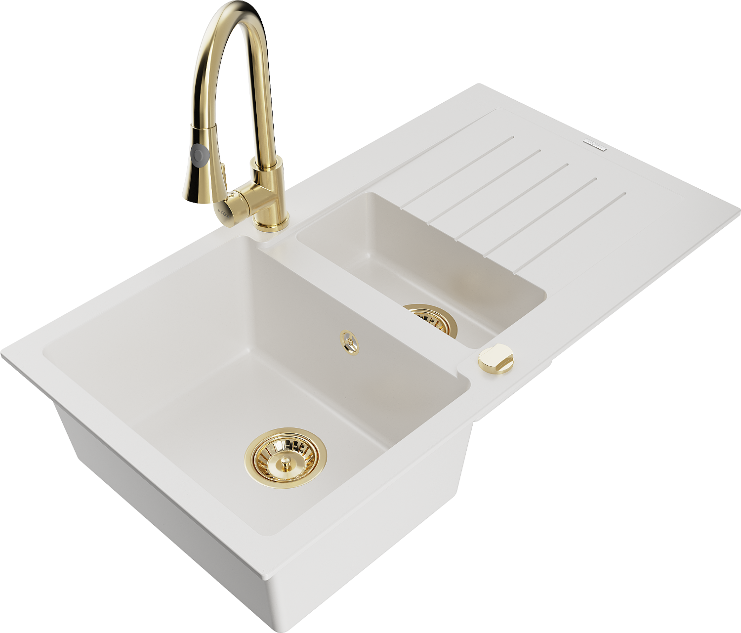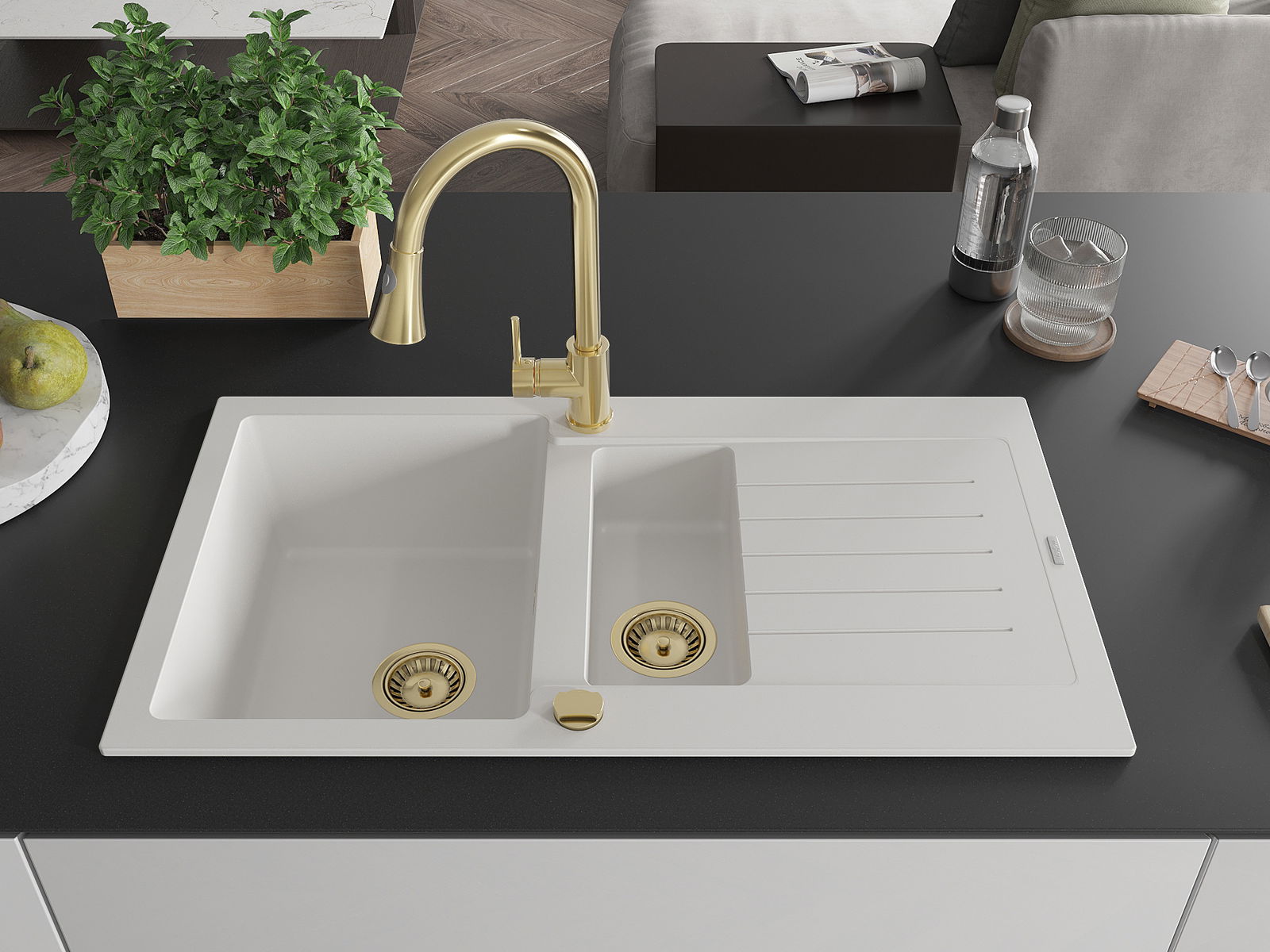 Mexen Matias granitinis plautuvas 1,5 kamerų su nuvarvėjimo lentyna ir virtuvės maišytuvu Elia, baltas - 6502-20-670101-50