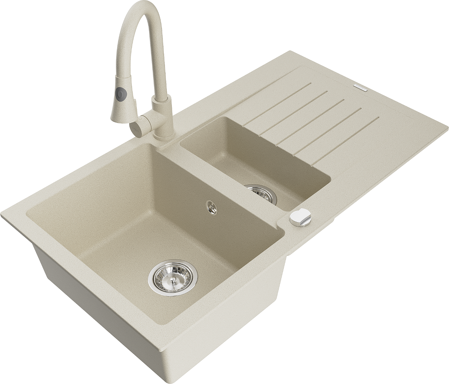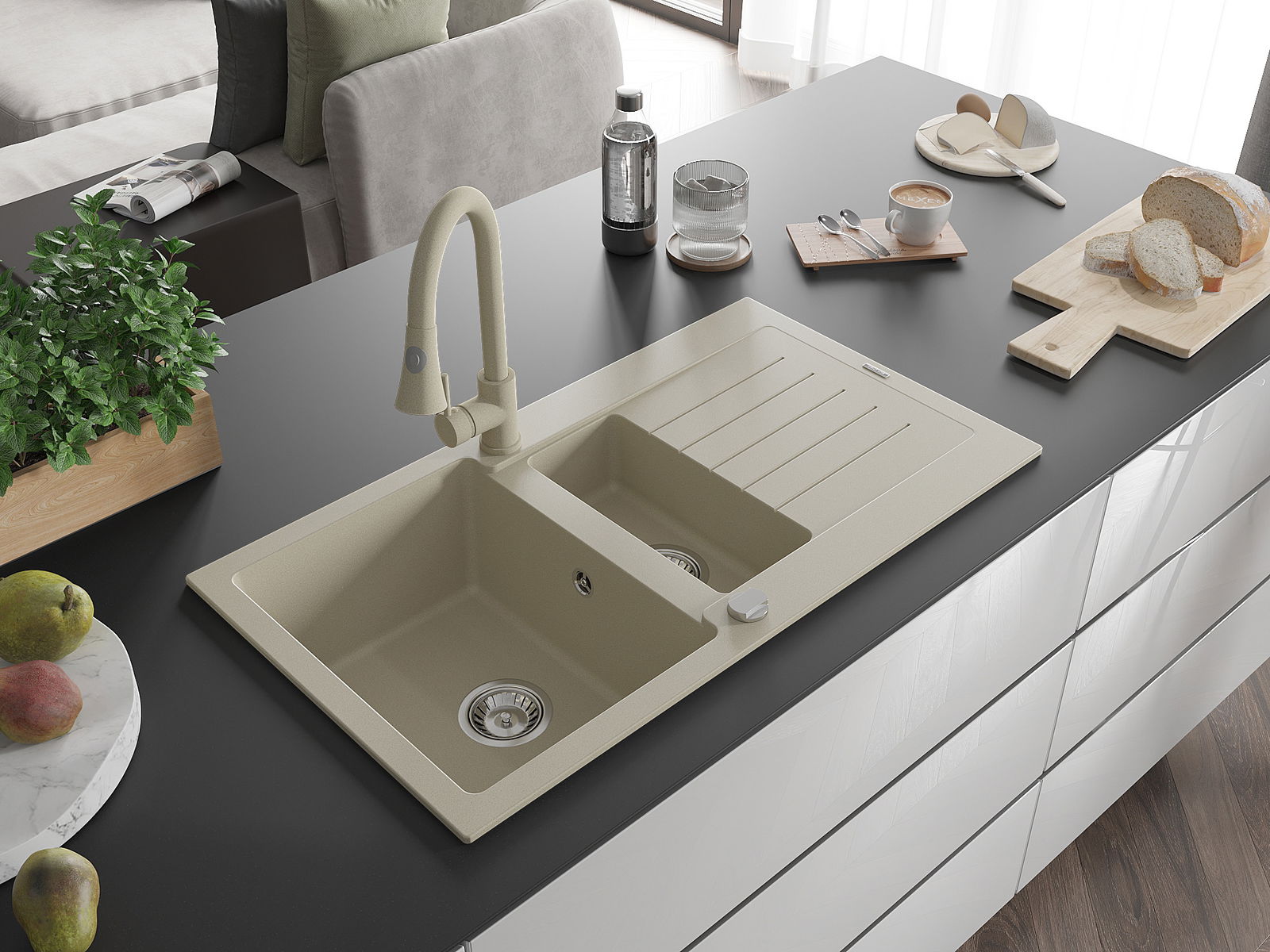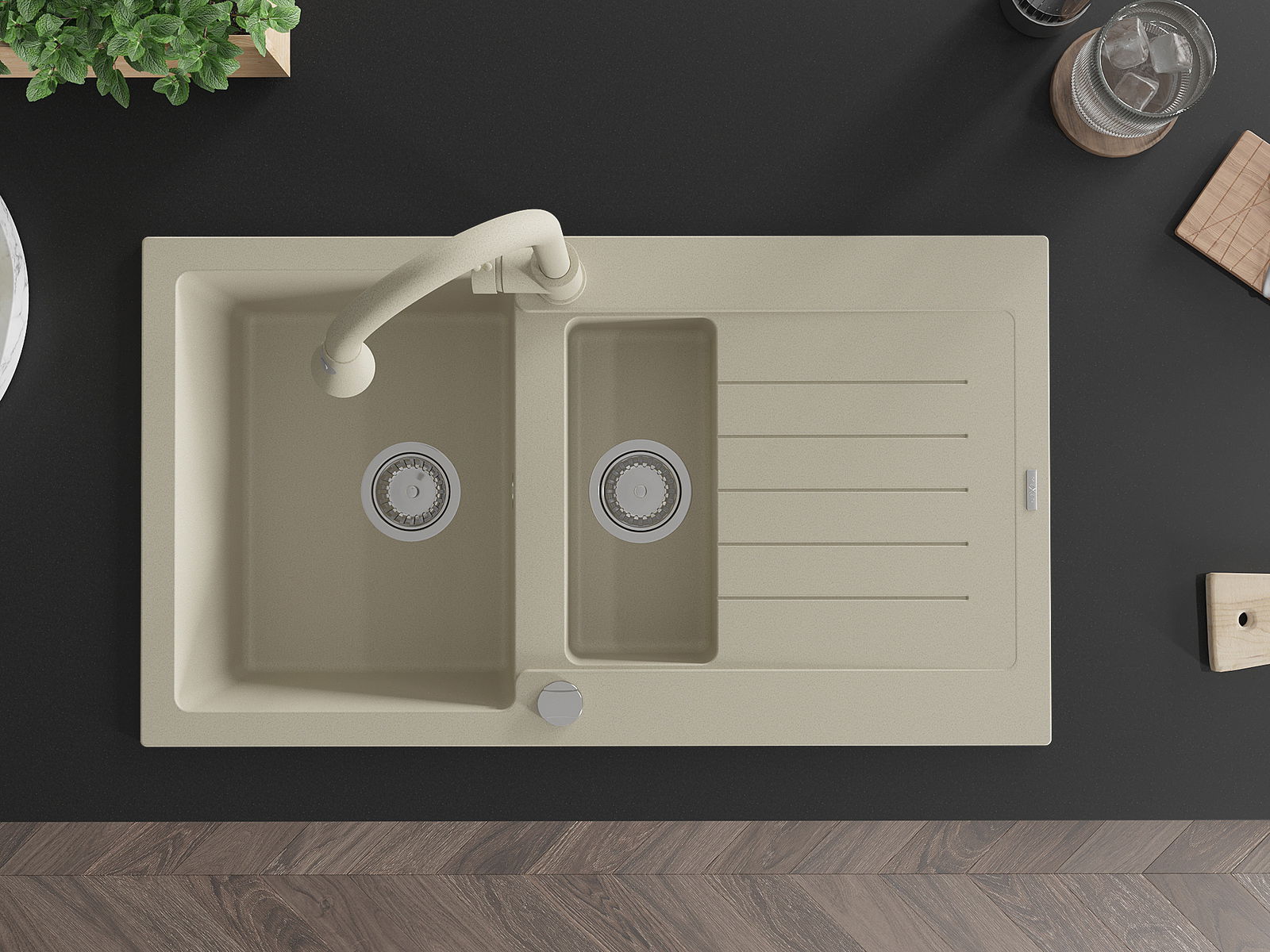 Mexen Matias granitinė 1,5 kamerų plautuvė su nusausintuvu ir virtuvės maišytuvu Elia, smėlio spalvos - 6502-69-670101-69