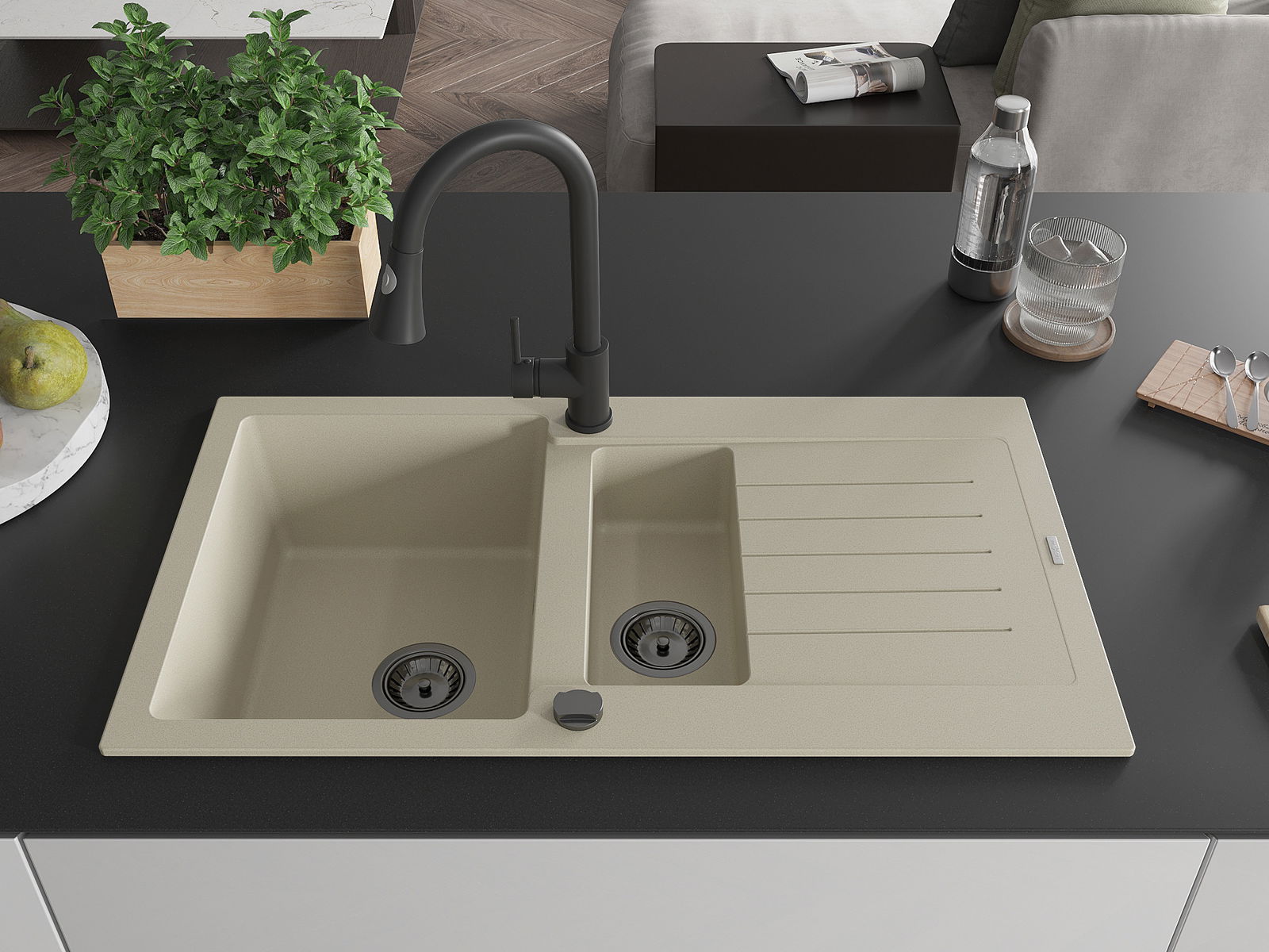 Mexen Matias granitinė 1,5 kamerų plautuvė su nusausintuvu ir virtuviniu maišytuvu Elia, smėlio - 6502-69-670101-70