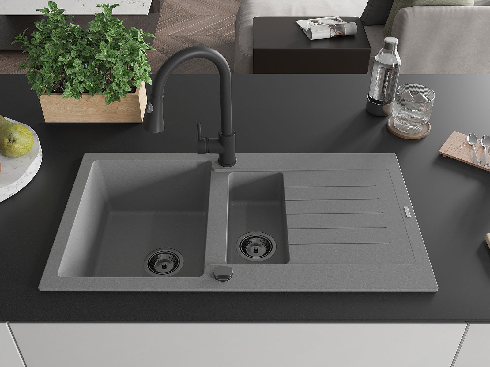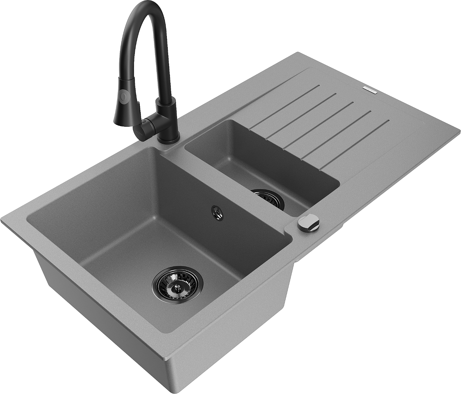 Mexen Matias granitinis plautuvė 1,5 kamerų su nutekamąja dalimi ir virtuviniu maišytuvu Elia, pilkas - 6502-71-670101-70-B