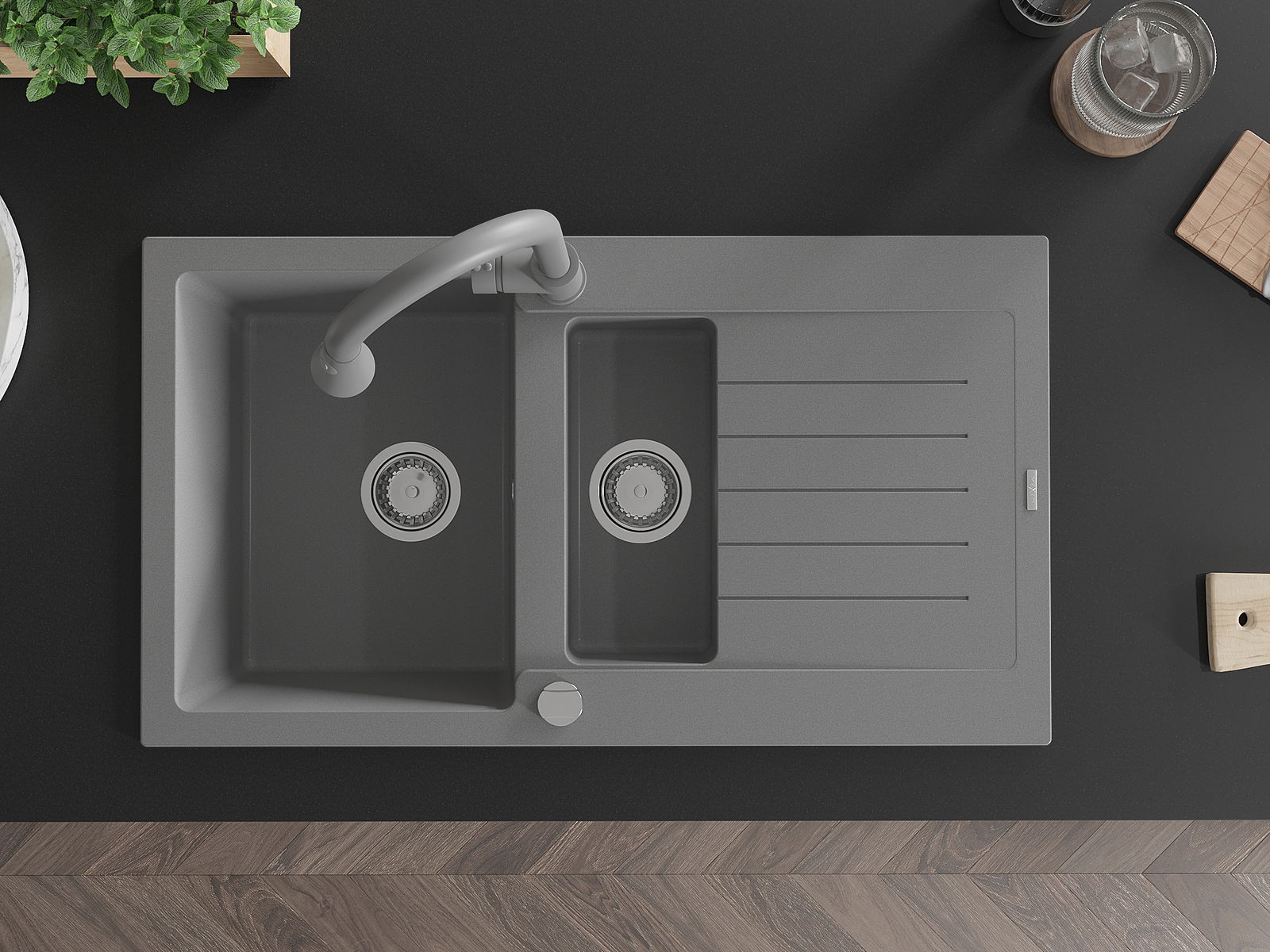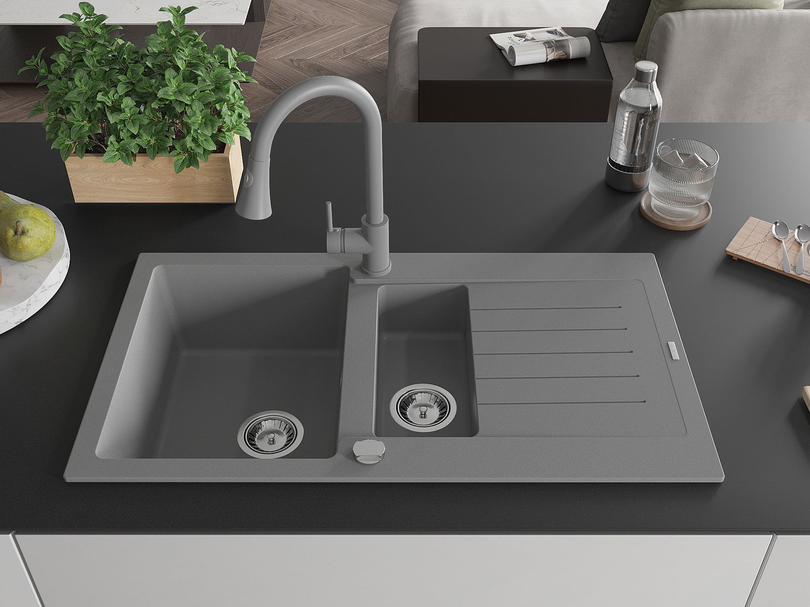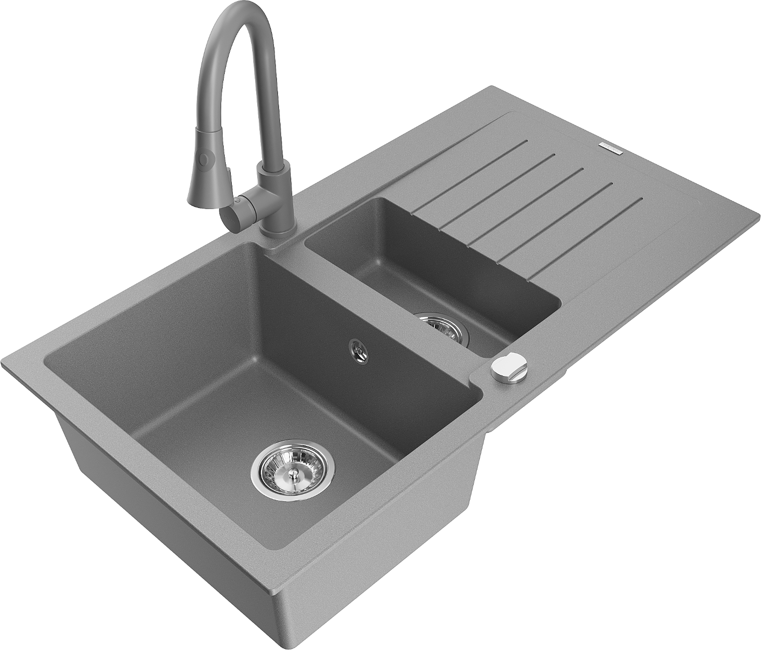 Mexen Matias 1,5 kamerų granito kriauklė su nusausintuvu ir virtuviniu maišytuvu Elia, pilka - 6502-71-670101-71