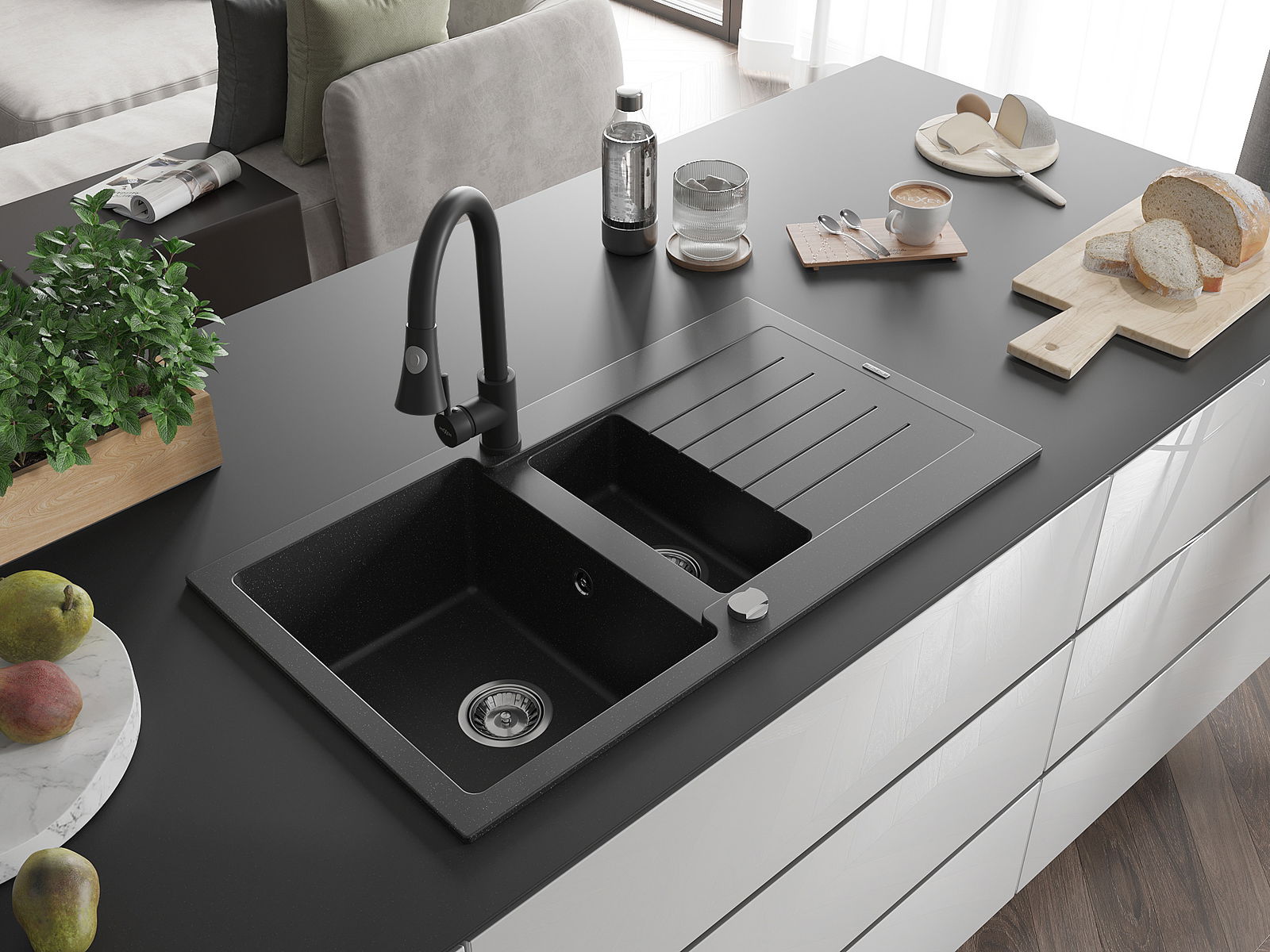 Mexen Matias granitinė dviejų kamerų plautuvė su nutekamu ir virtuviniu maišytuvu Elia, juoda/sidabro metalikas
